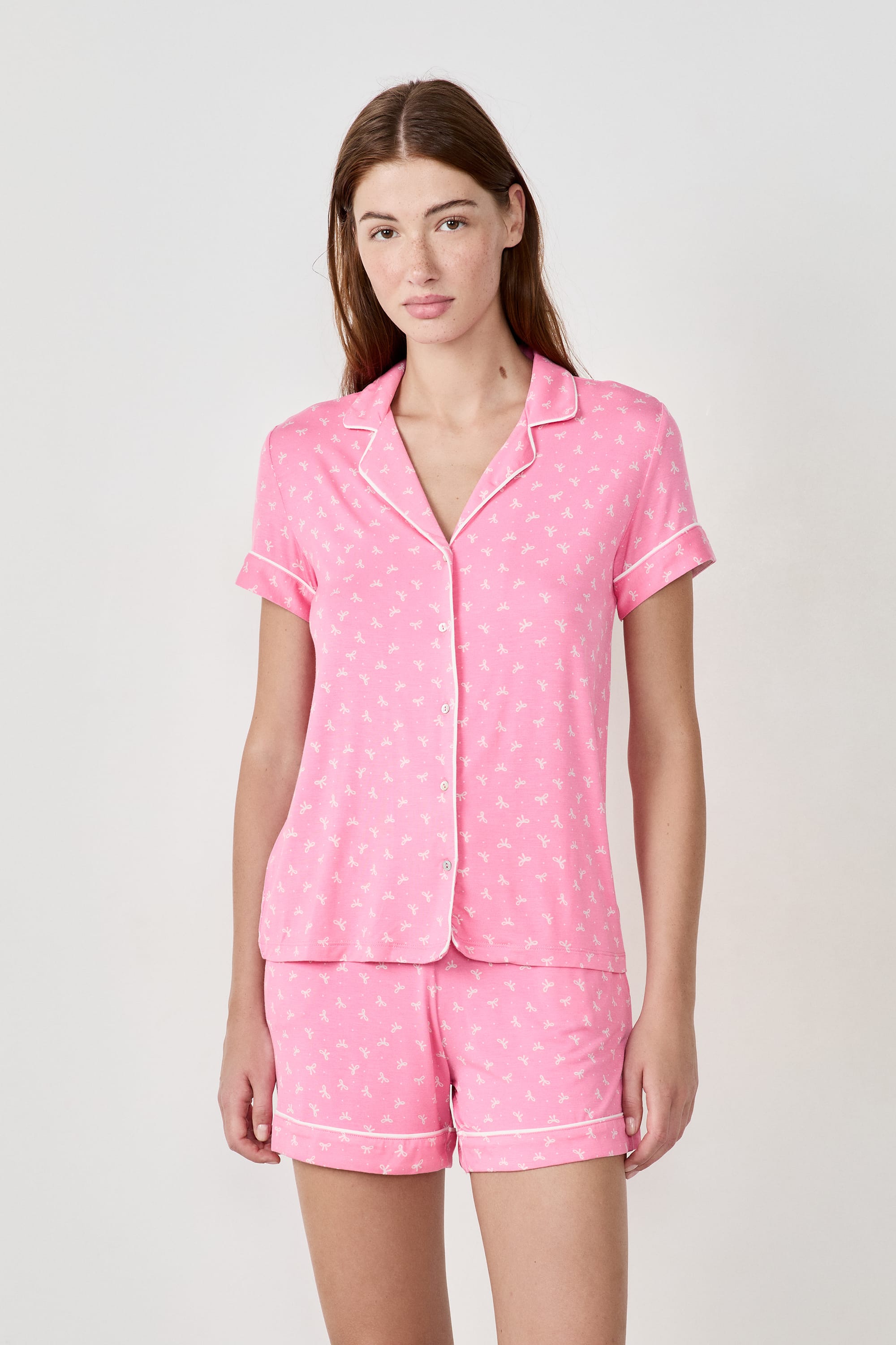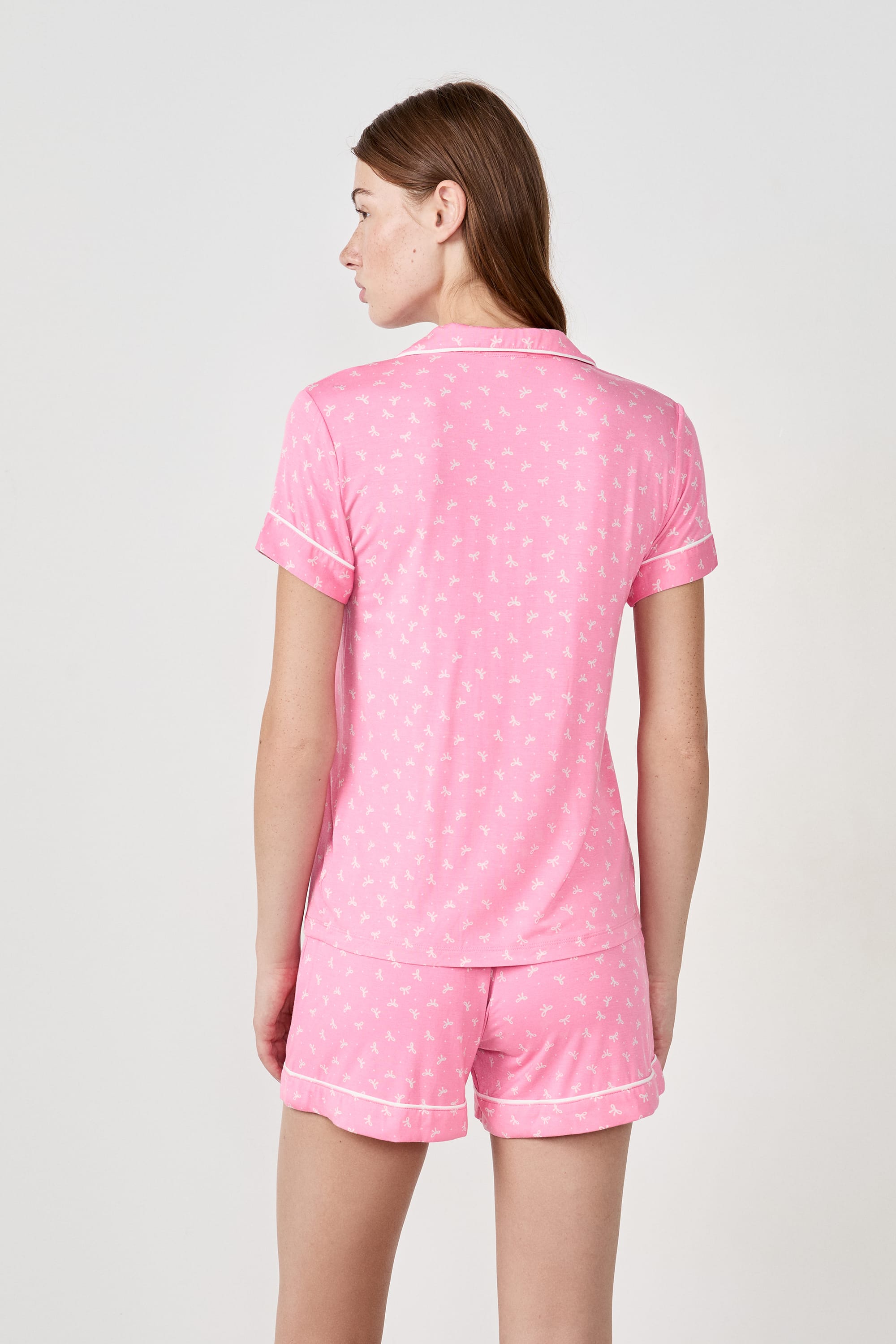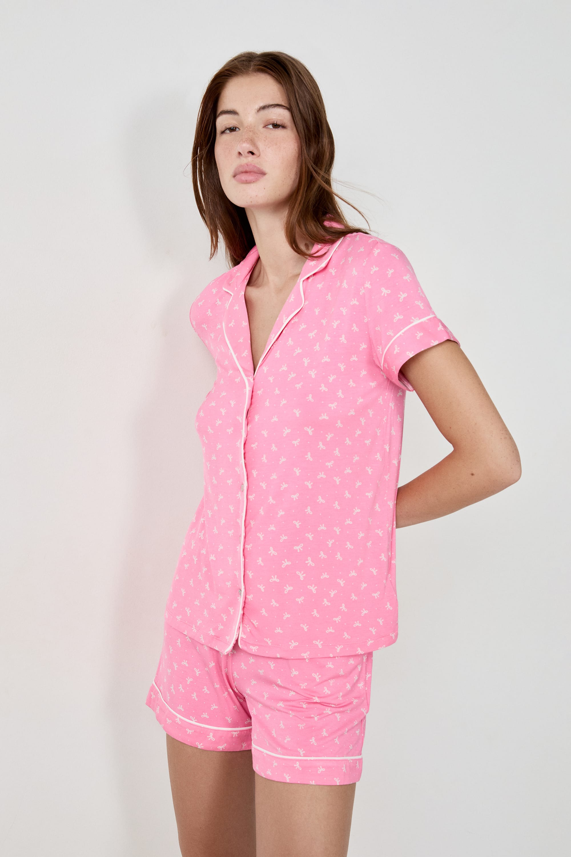 Confectionné en matière douce, ce set de pyjama comprend une chemise manches courtes et un short. Il est réhaussé d'un imprimé nœuds et d'un liseré contrasté pour une note plus sophistiquée.