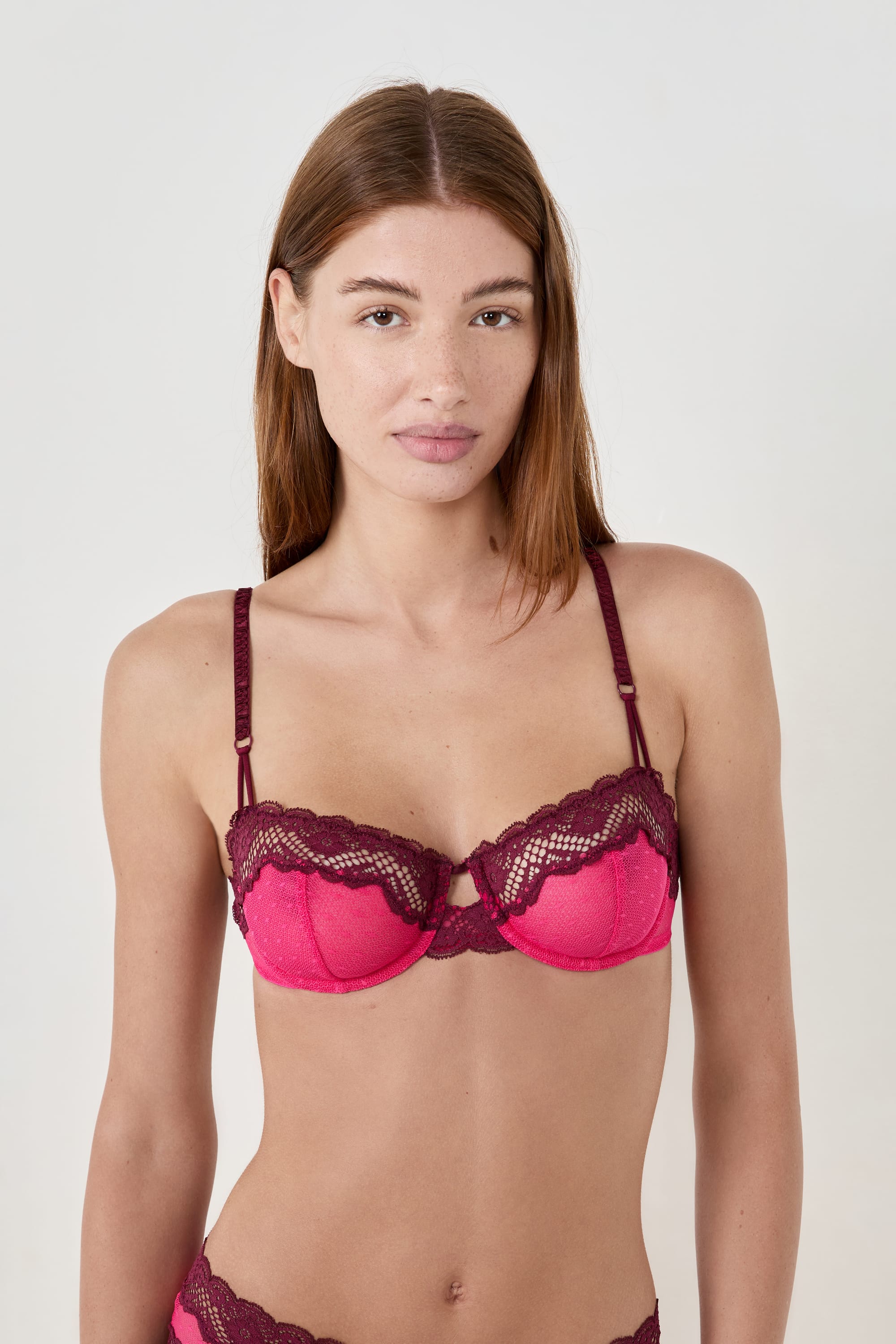 This bra is adorned with contrasting lace scalloped edges. Its balconette shape without padding ensures light and perfect support.
