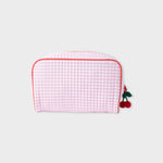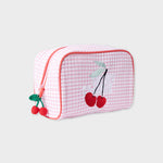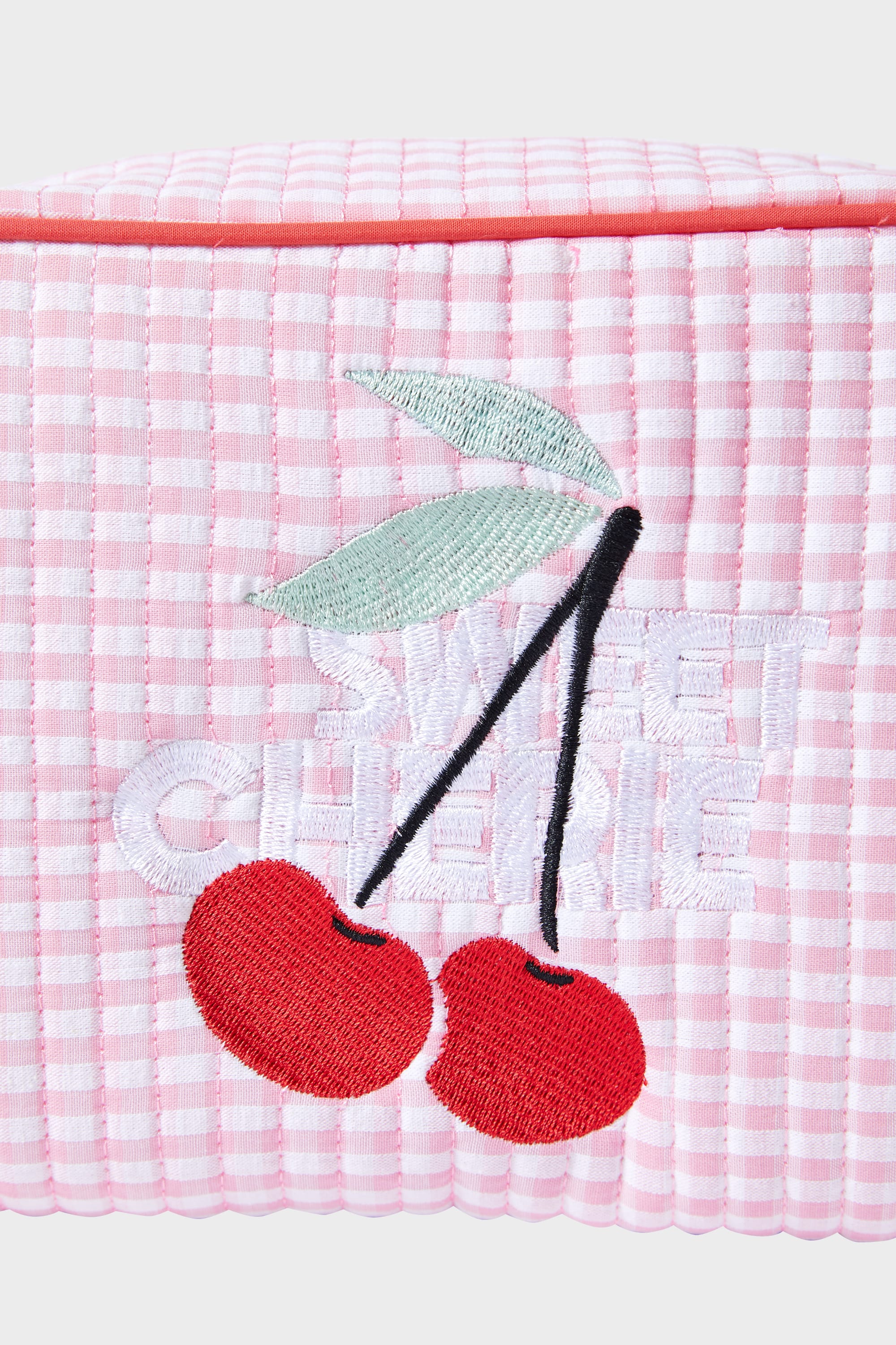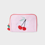 Made of cotton, this delicate pouch is inspired by cherries. It is adorned with topstitching, decorated with stripes, and equipped with cherry-shaped hooks.