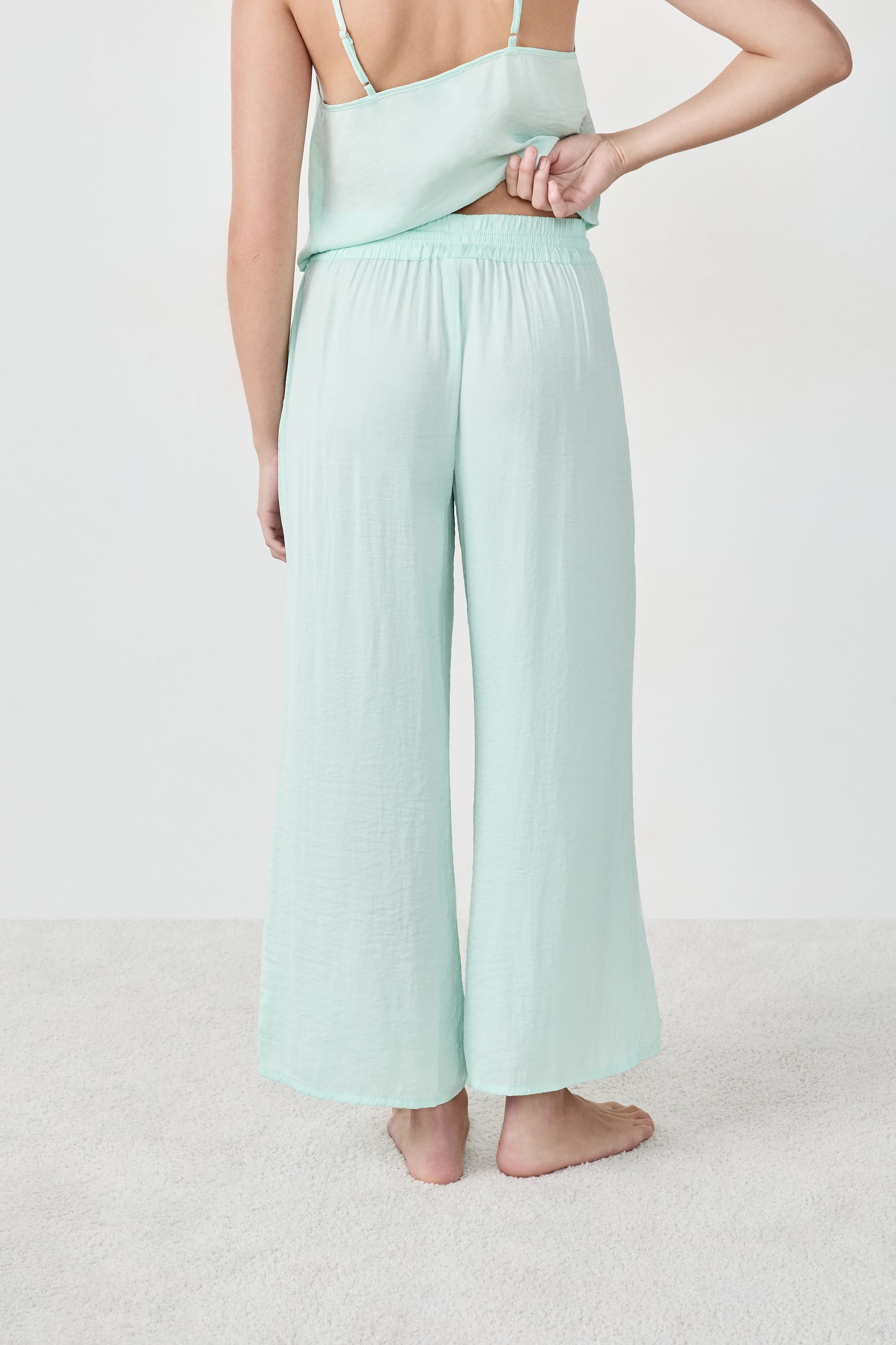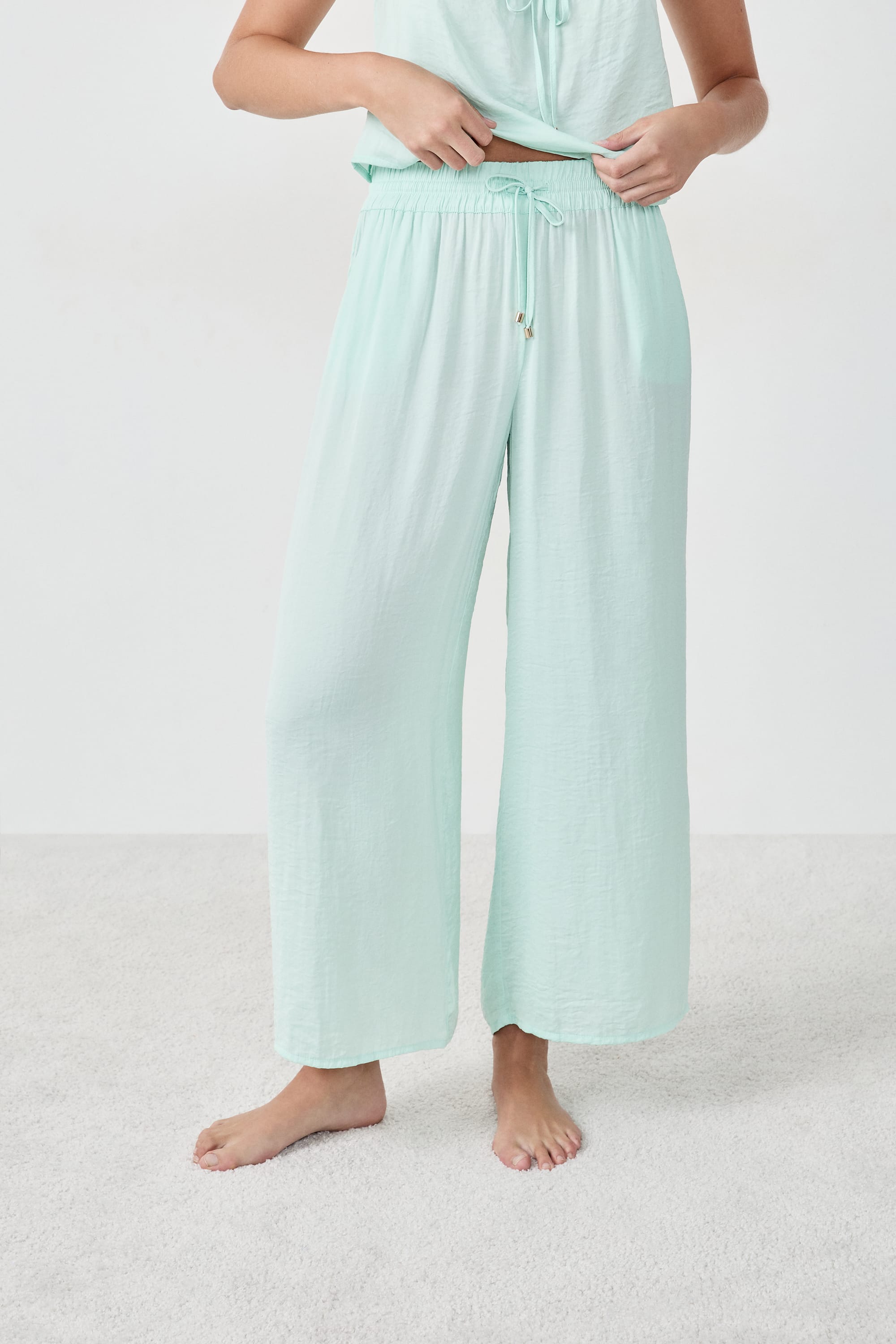 Elegant and refined, these satin pants feature a cropped wide-leg 7/8 cut. With pockets and an elastic waistband, they offer fluid movement and effortless style—perfect from day to night.