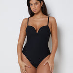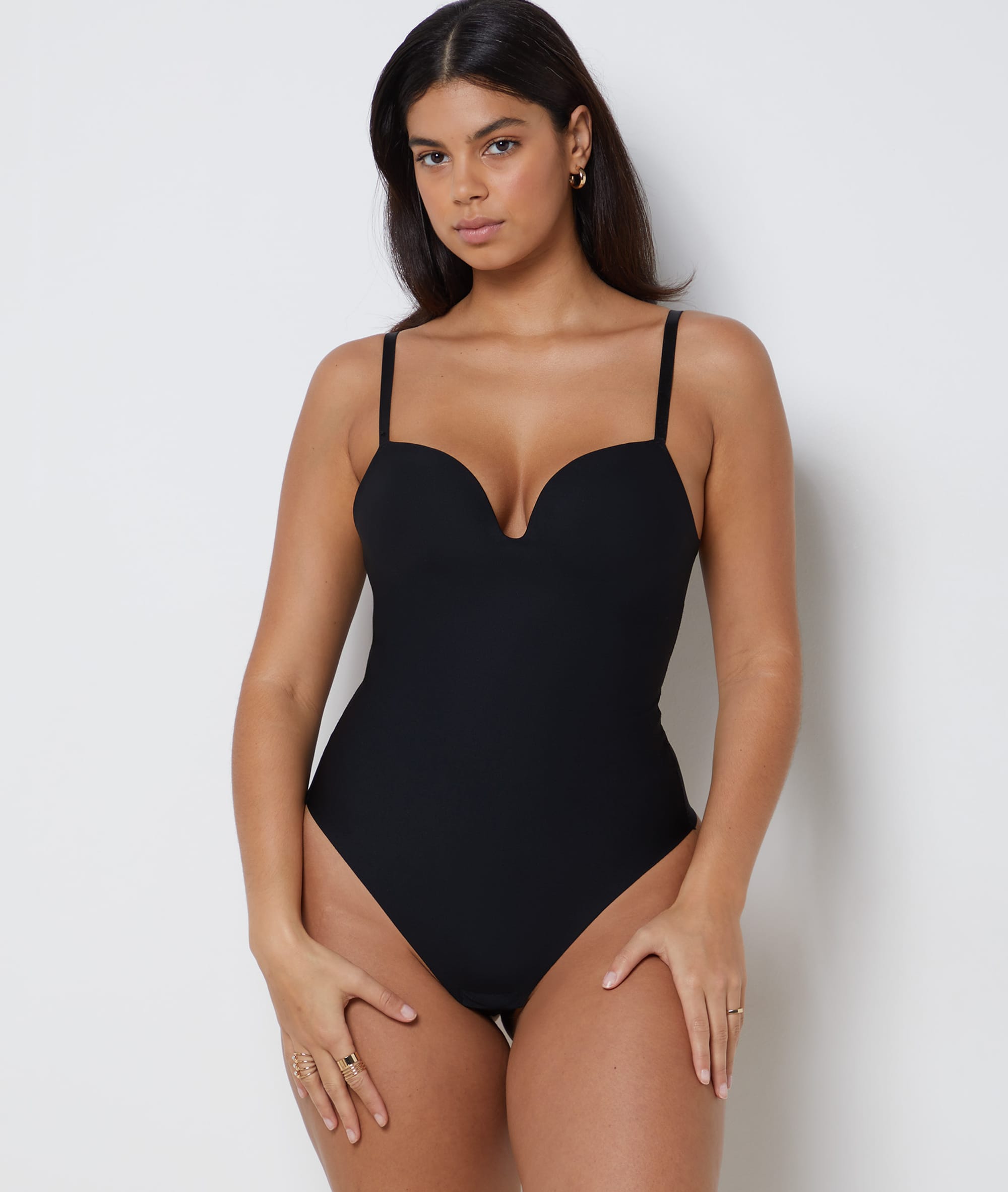 Redefine the lines of your silhouette in this ultra-comfortable shaping bodysuit that offers excellent support at the neckline. • Bodysuit • Cups • Heart-shaped neckline • Adjustable straps • Shaping material