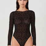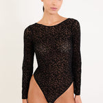 This bodysuit is dressed in a leopard print velvet. It plays with transparency and reveals a bare back.