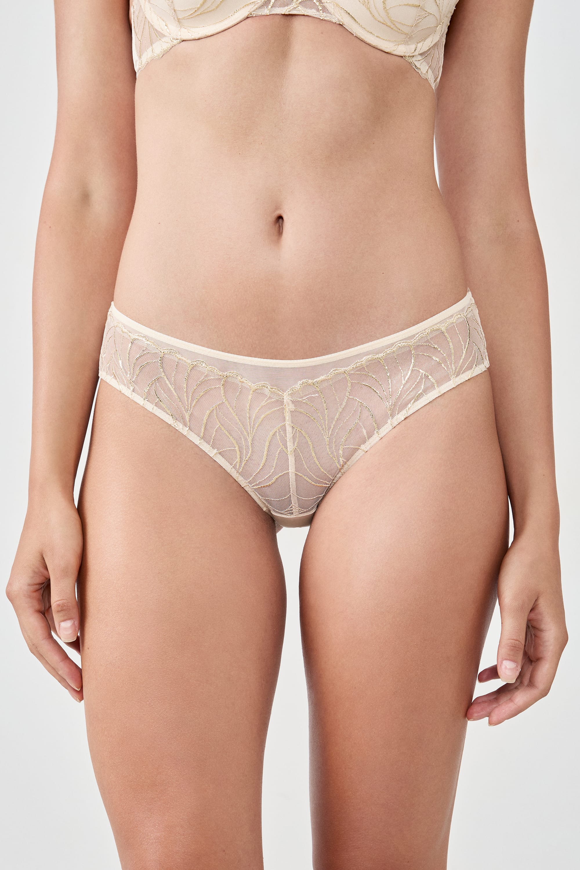 This tulle and satin microfiber hipster features delicate embroidery and a lightly sequined scalloped edge.