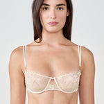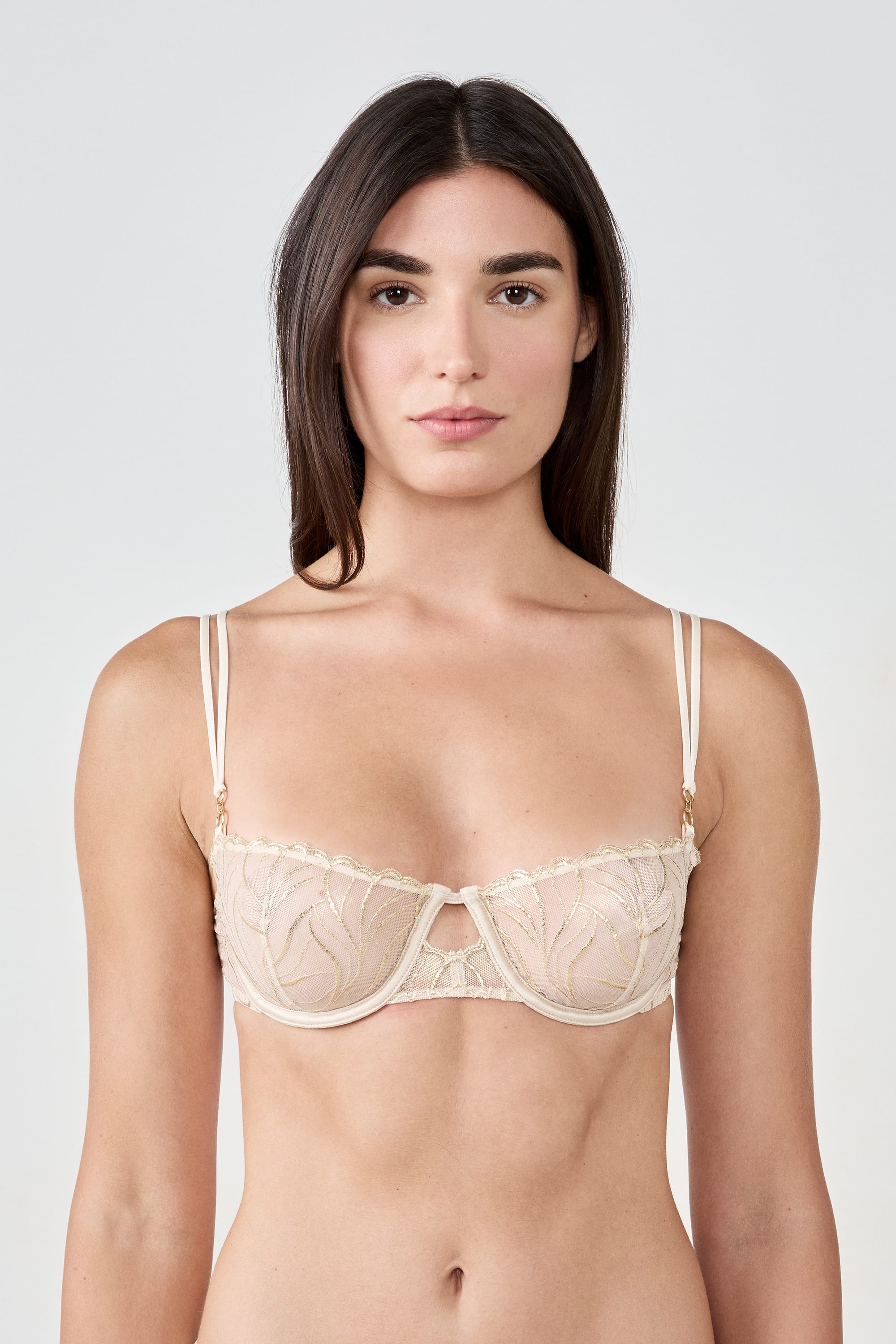 This balconette bra features delicate embroidery and a lightly sequined scalloped edge. Featuring underwire, it provides perfect support and is enhanced by a double ring at the strap.
