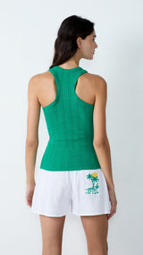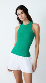 Timeless in the wardrobe, the round-neck tank top is reinvented with openwork details on the front.