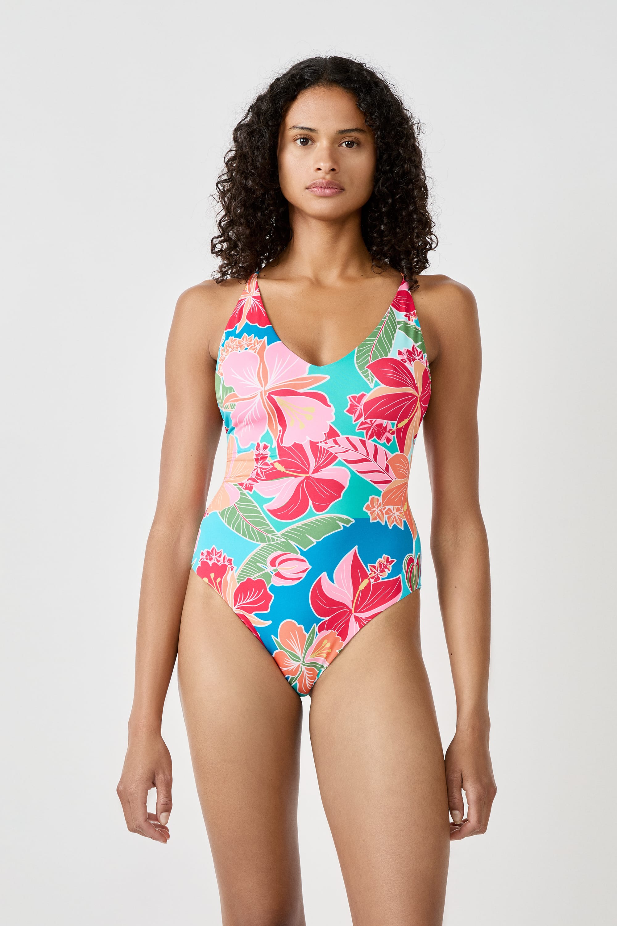 The hibiscus print, the flower of the season, is featured on this one-piece swimsuit. At the back, it reveals an intricate construction, with ring details and ties to knot.