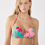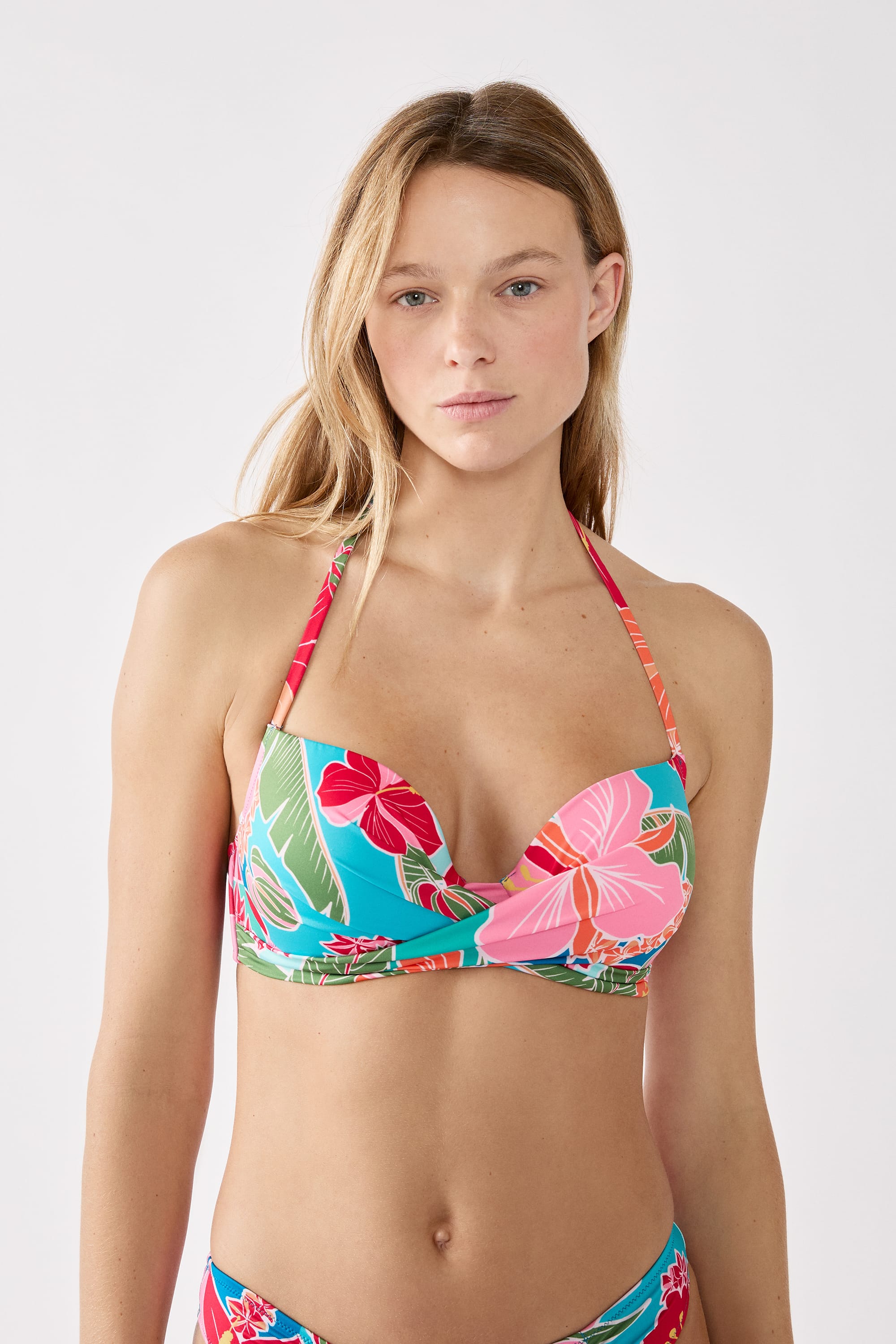 Floral prints are showcased on this bikini top, enhanced with a crossover drape at the front. Its push-up shape adds a fuller cup for a boosted cleavage. Create a total look with the matching bottoms.