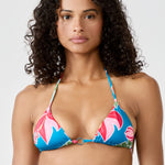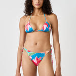 The hibiscus print, the flower of the season, adorns this triangle bikini top. Decorated with a ring between the cups, it perfectly supports the chest for sea bathing.