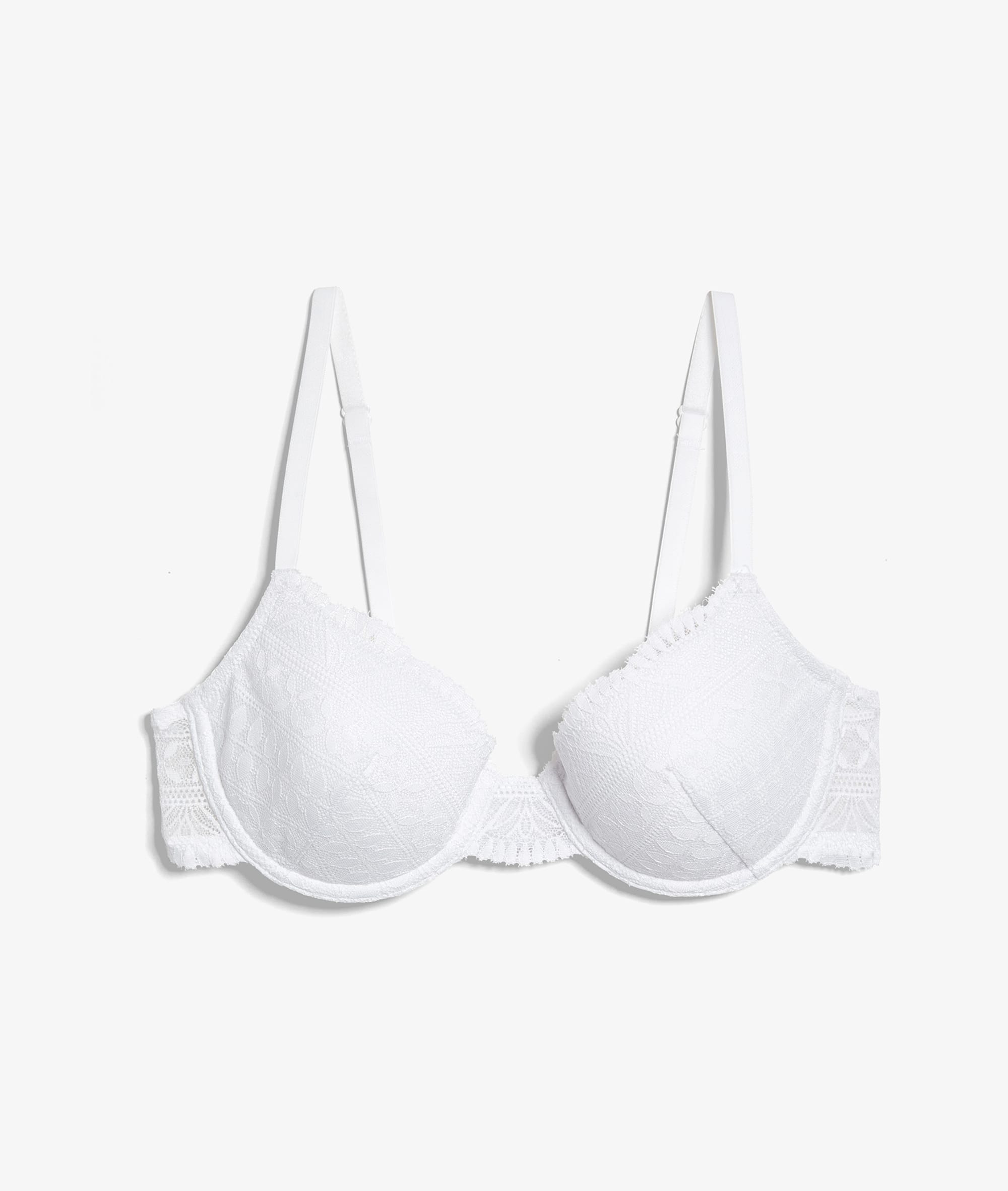 Delicate, refined, and sexy: we've taken our Idole lace and spiced it up to the perfect every day bra that beings you comfort and allure. This push up bra comes with padding and underwire to give you lift and shape, plus a plunging neckline for a sexy look. It features adjustable straps and a back clasp to keep everything in place. • Push-up • Style #2: The Plunge Push-up • Push-up effect • Lace • Padding +1 cup size • With underwire • Adjustable Straps • Specifically designed for D cups and above: wider straps, higher back, and tulle reinforcement • Back clasp