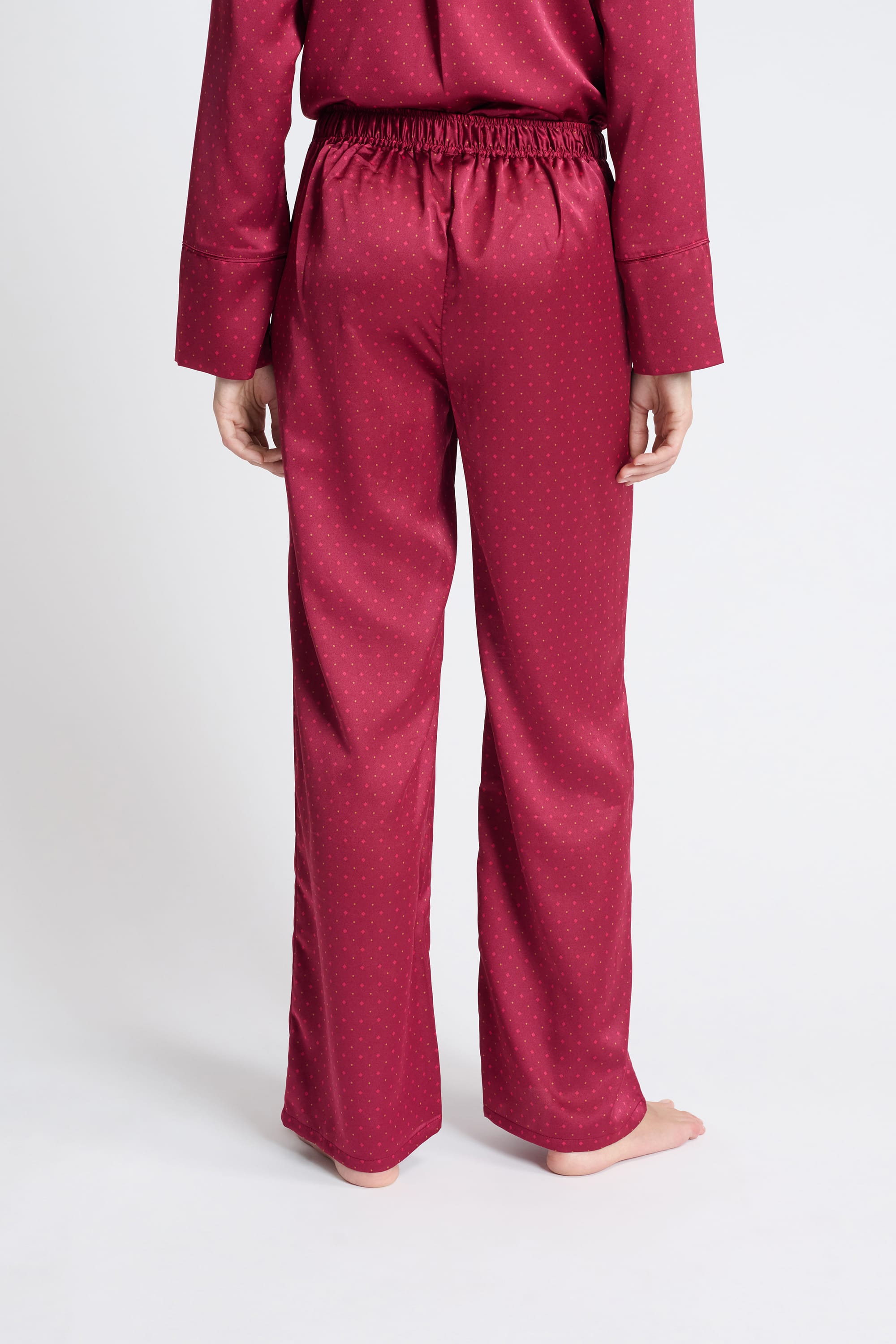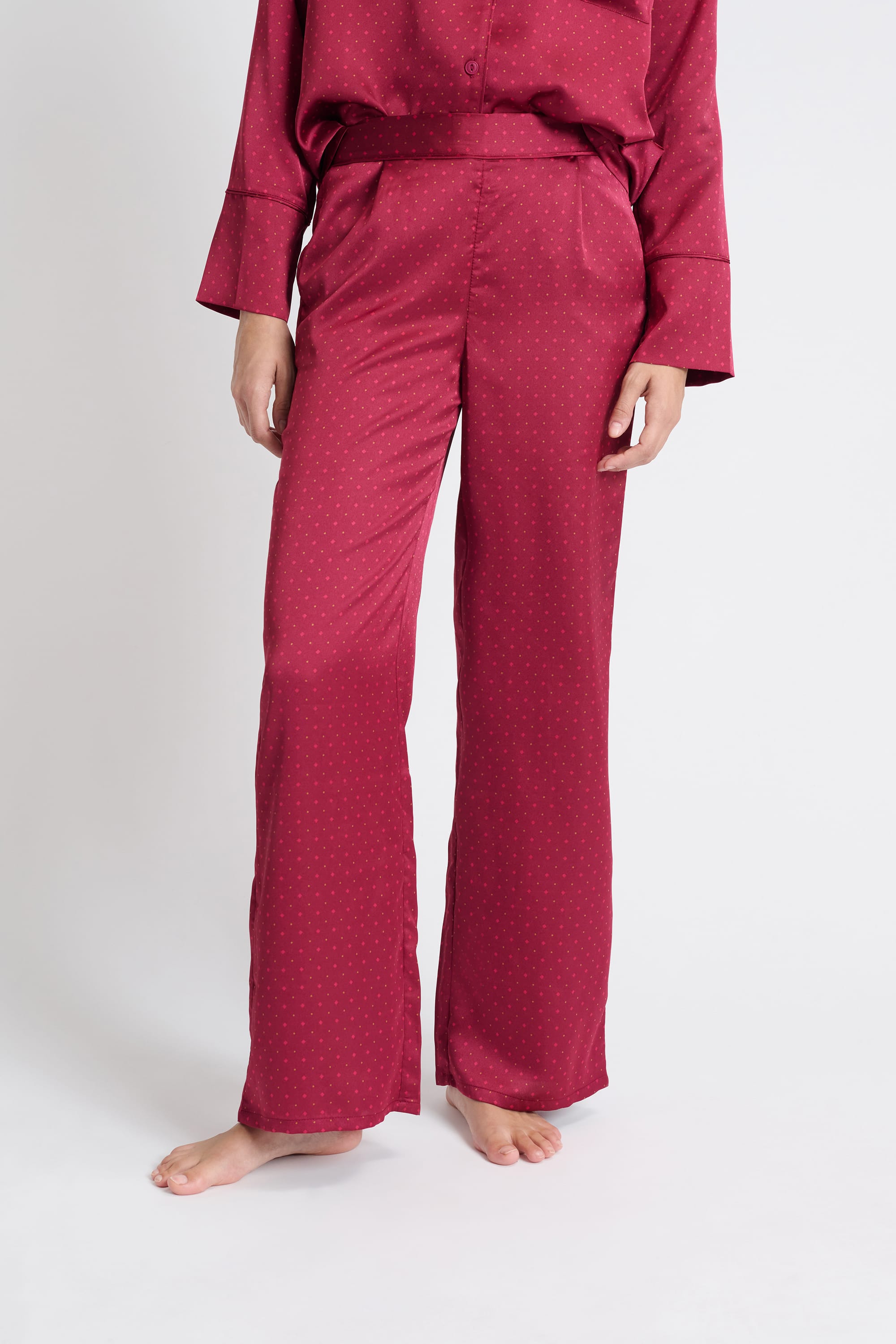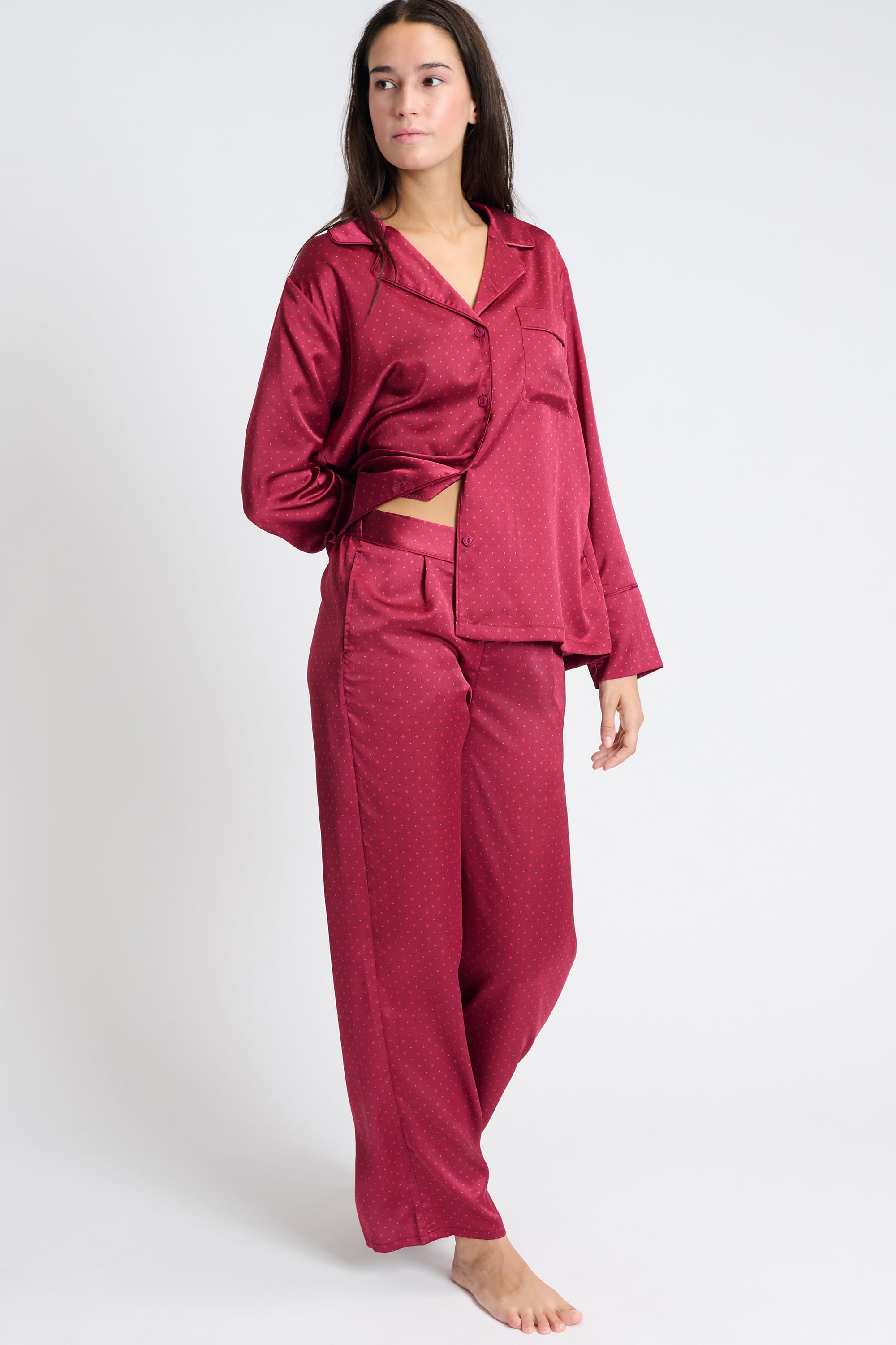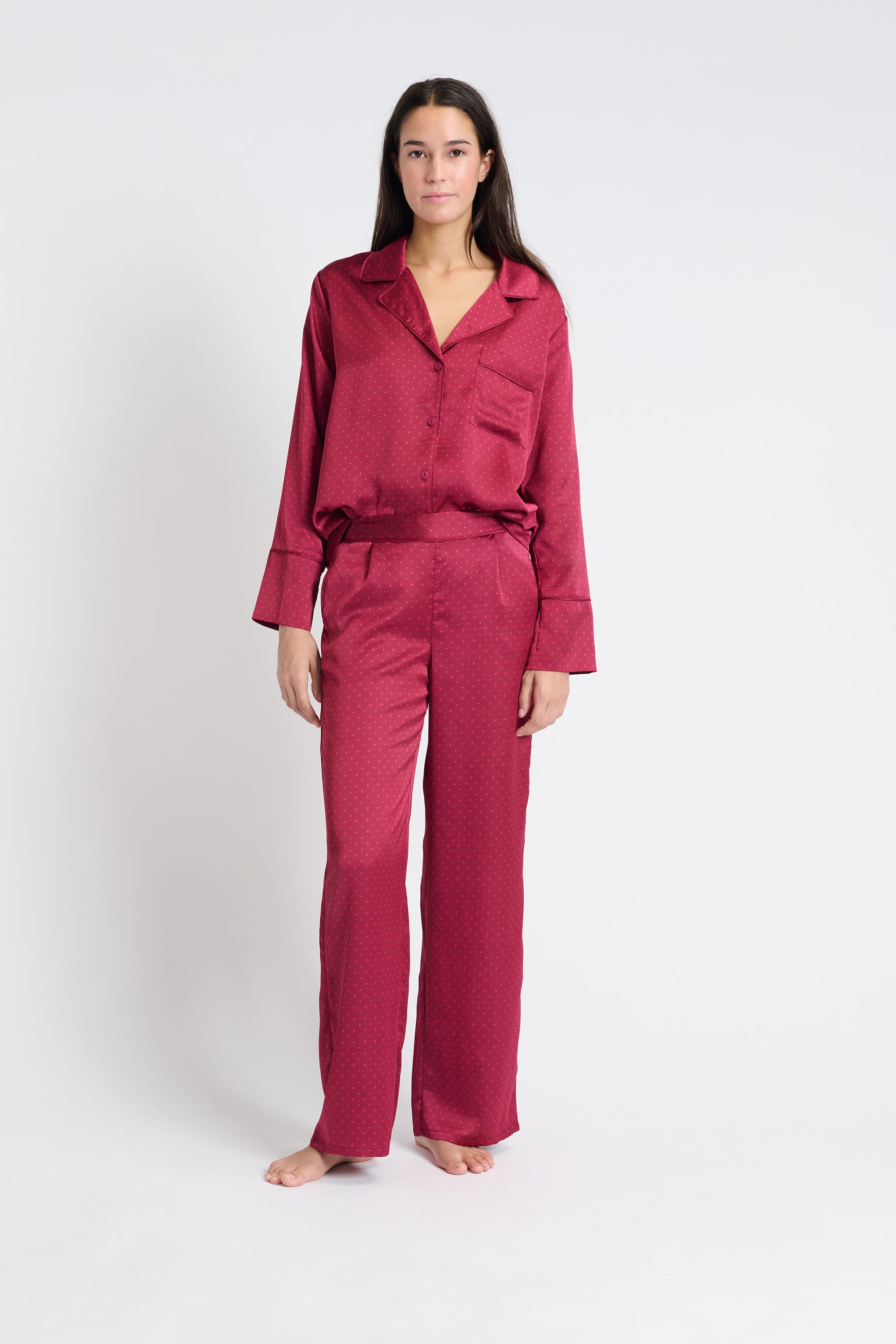 Elegant and refined, these satin pajamas feature polka dots. They offer a flowing cut for soft, light nights.