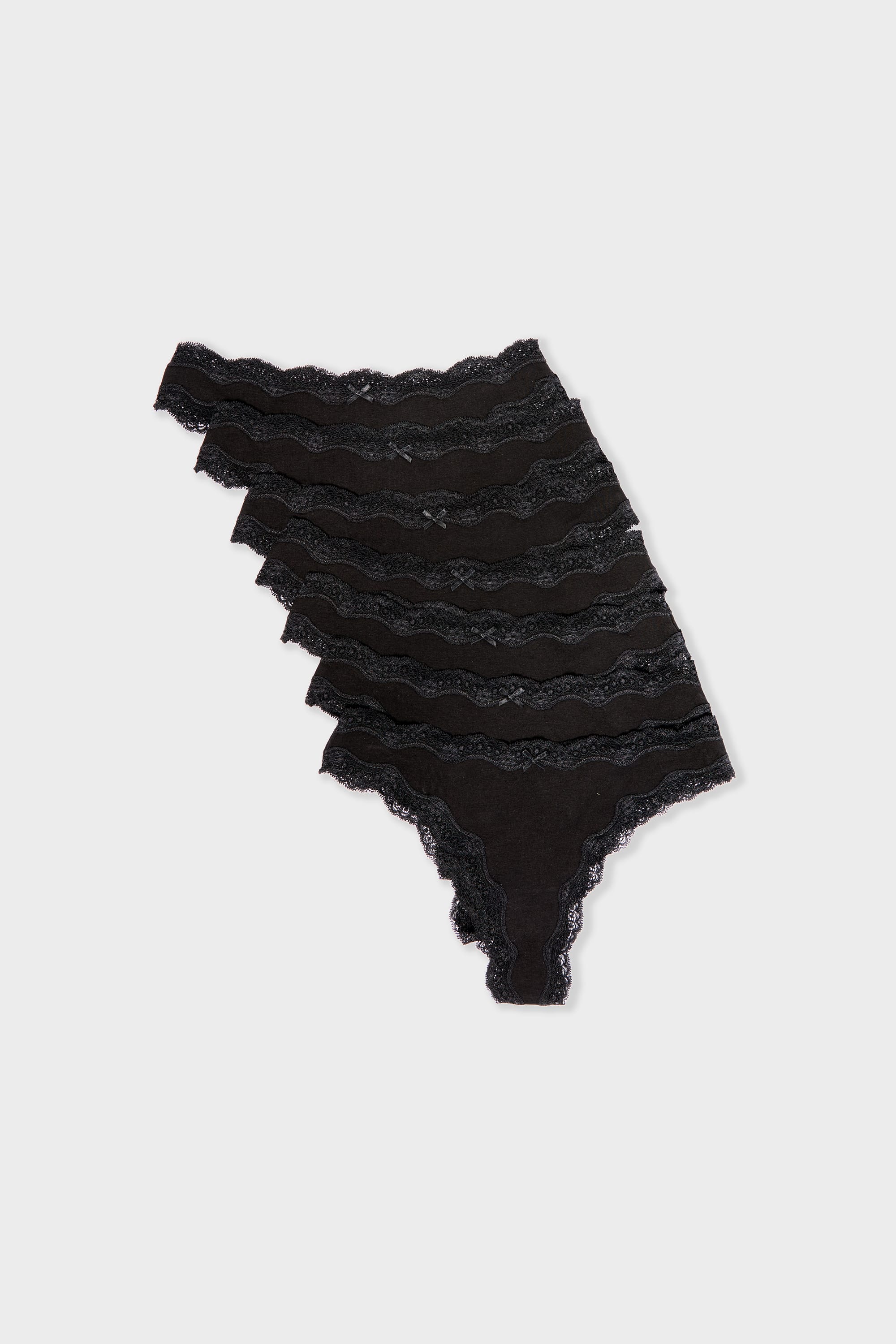Your everyday thongs in a pack of seven! Edged with wavy lace and adorned with a small bow at the front, these thongs feature a perfectly fitted cut, carefully crafted in super soft cotton.