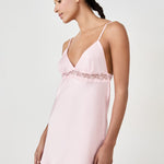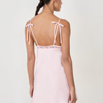 Adorned with a thin band of transparent floral lace, a bow between the cups, and thin tie straps, this must-have piece exudes delicacy. With its V-neck, it reveals a plunging neckline.