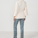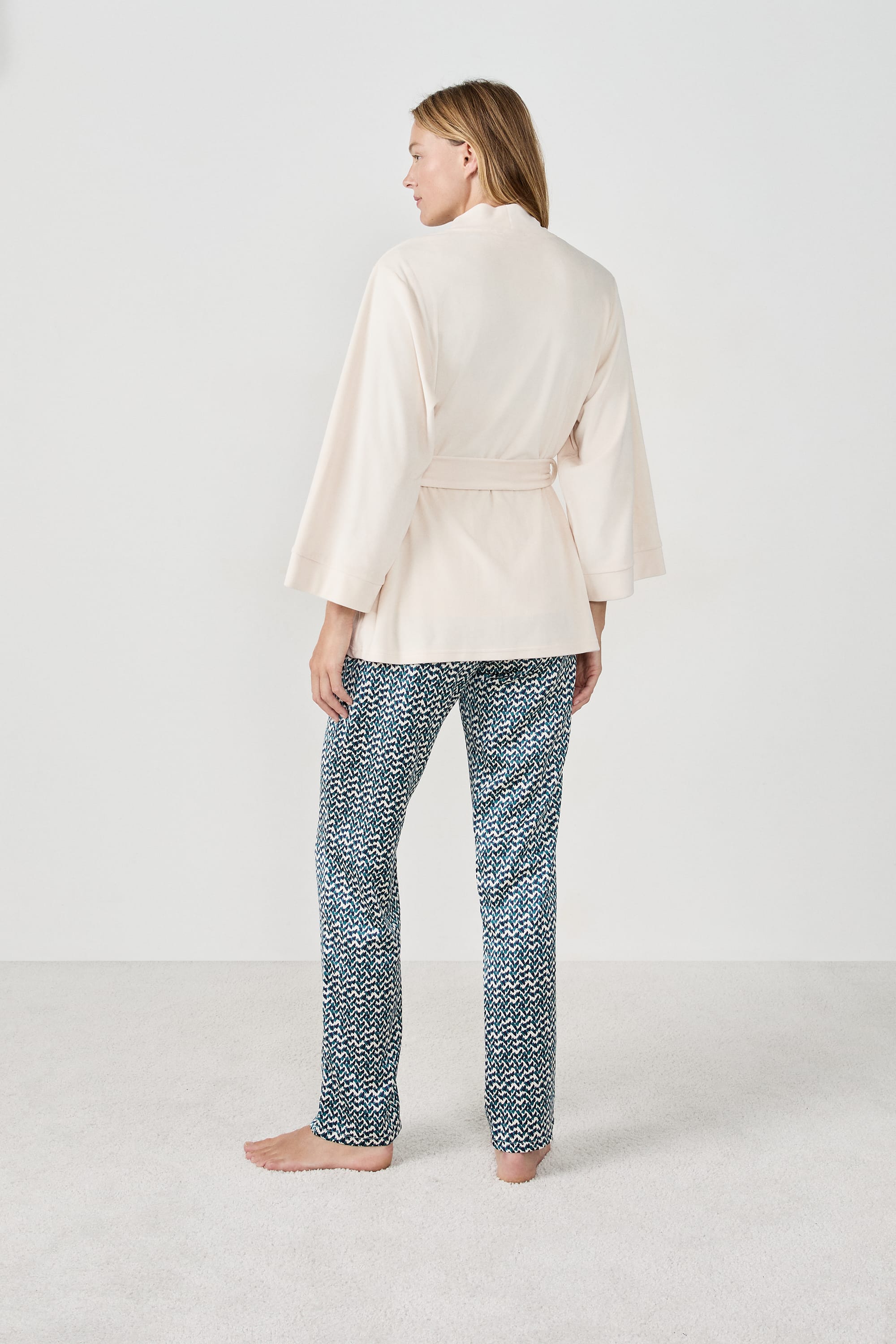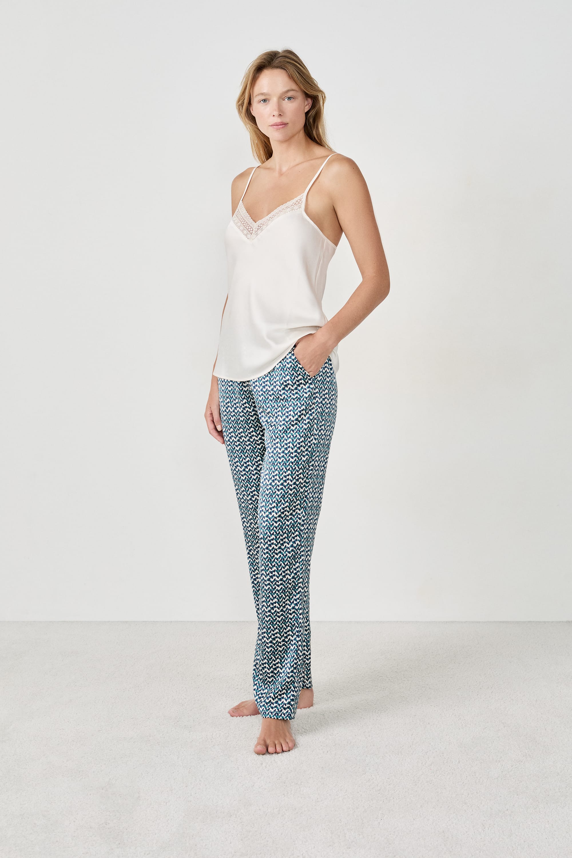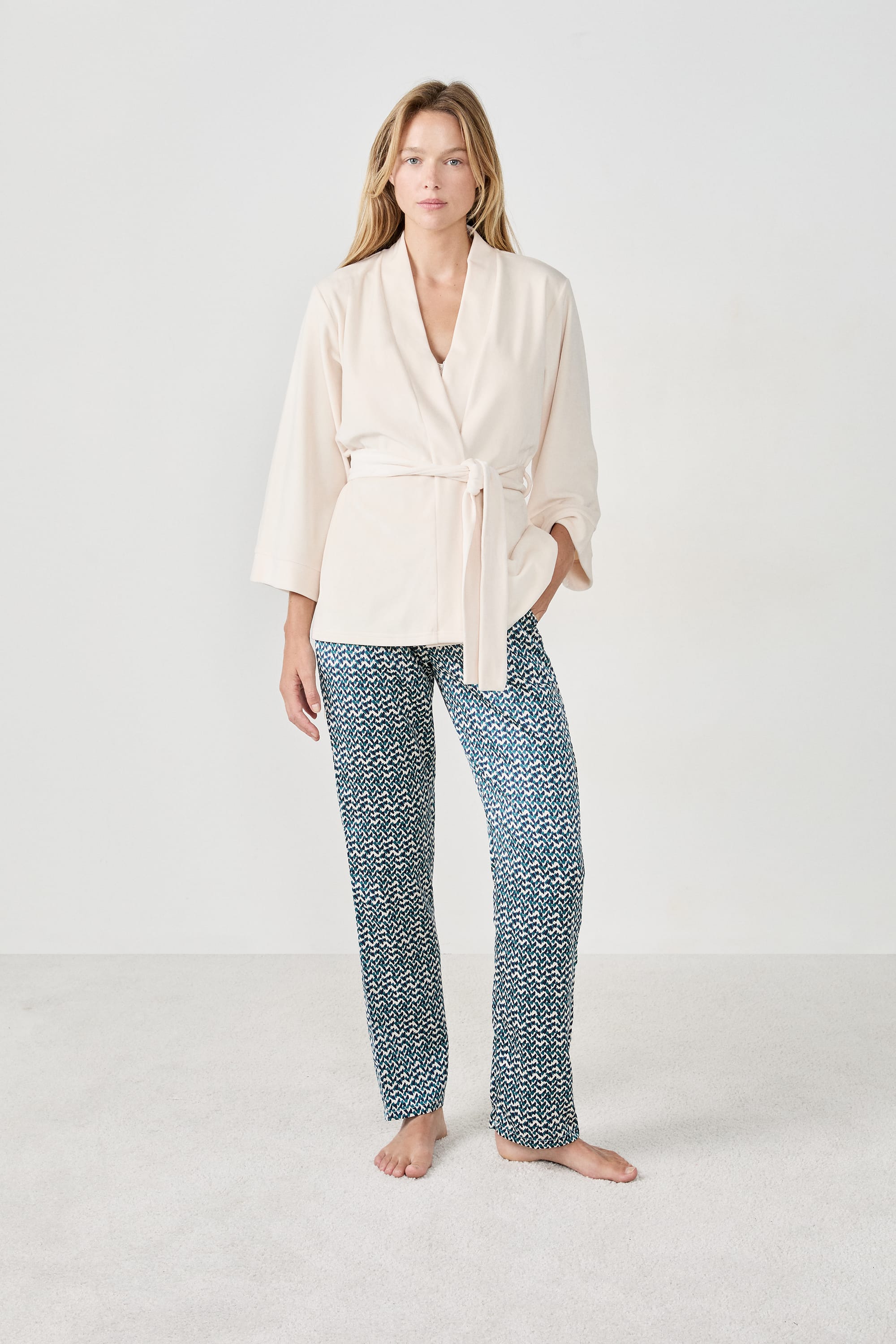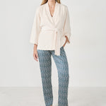 Perfect for soft and cosy nights, this pyjama set includes a camisole, trousers and a robe. This scalloped-edge camisole pairs with the flowing trousers featuring a graphic print. They are enhanced by a robe with a short and flowing cut.