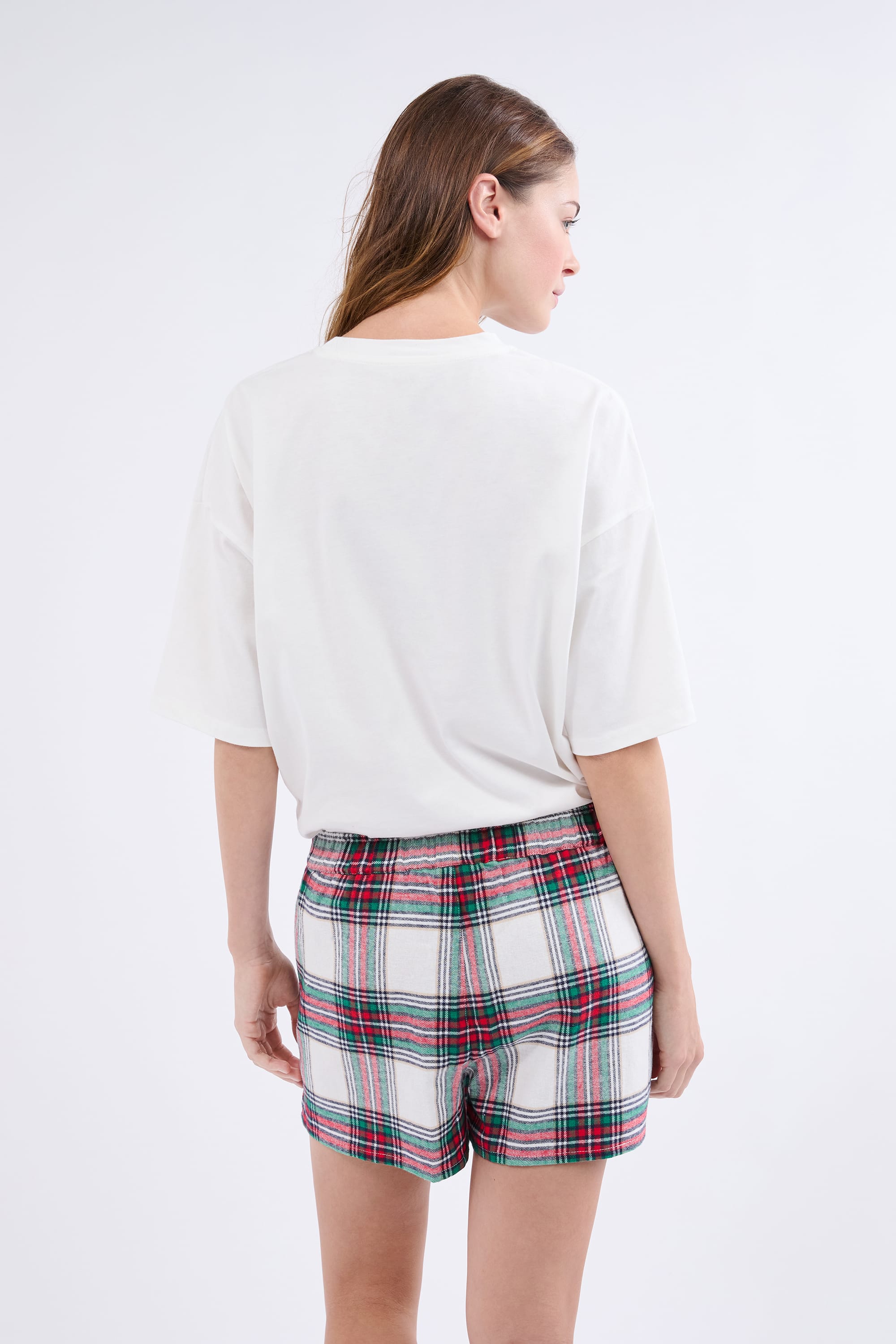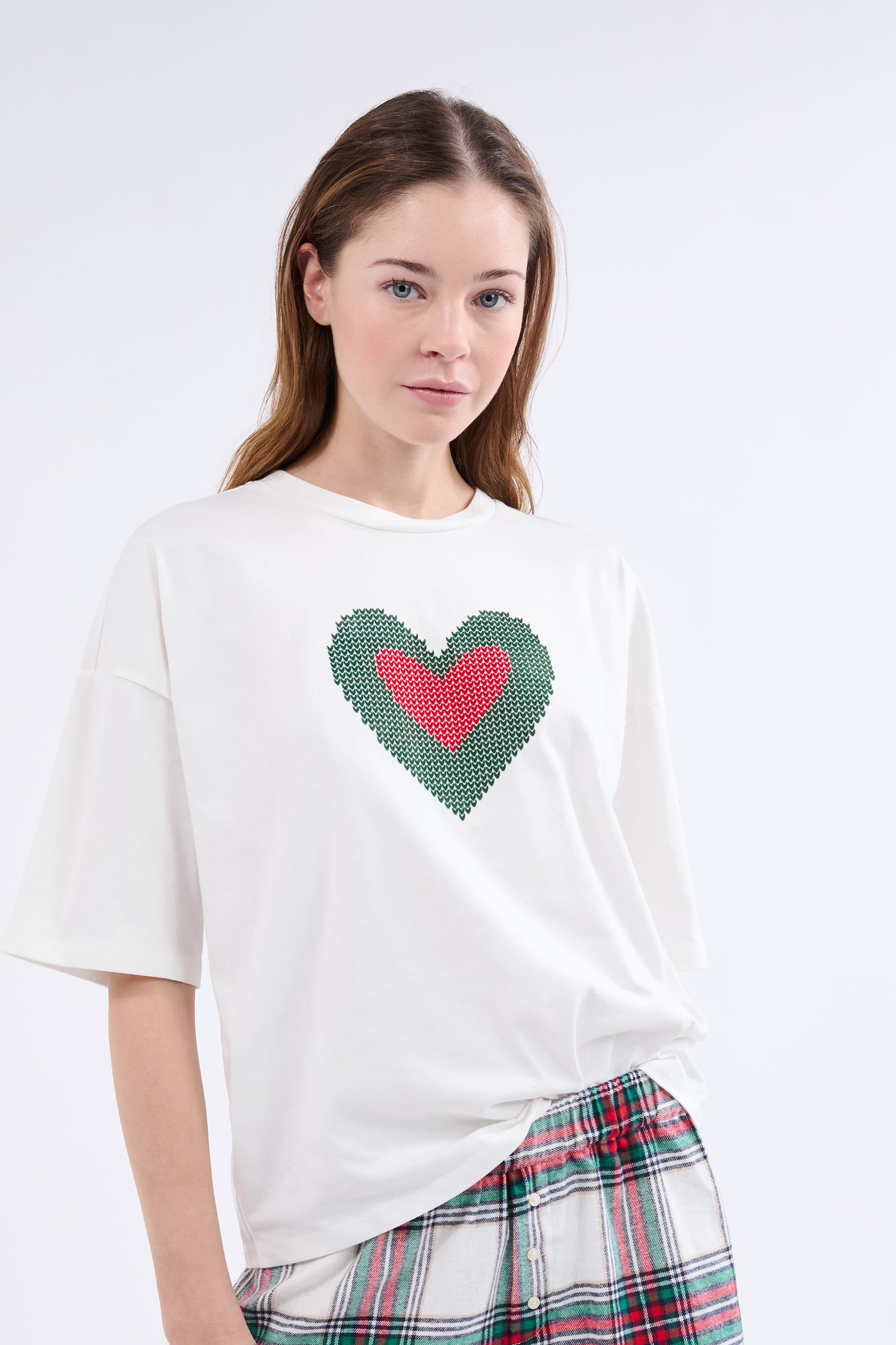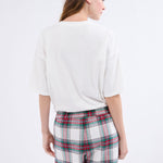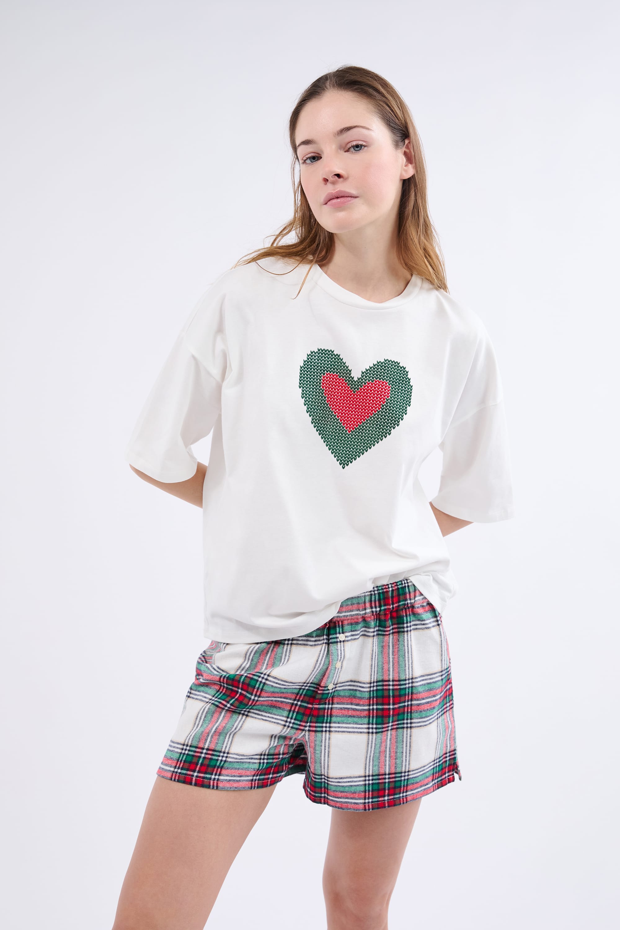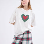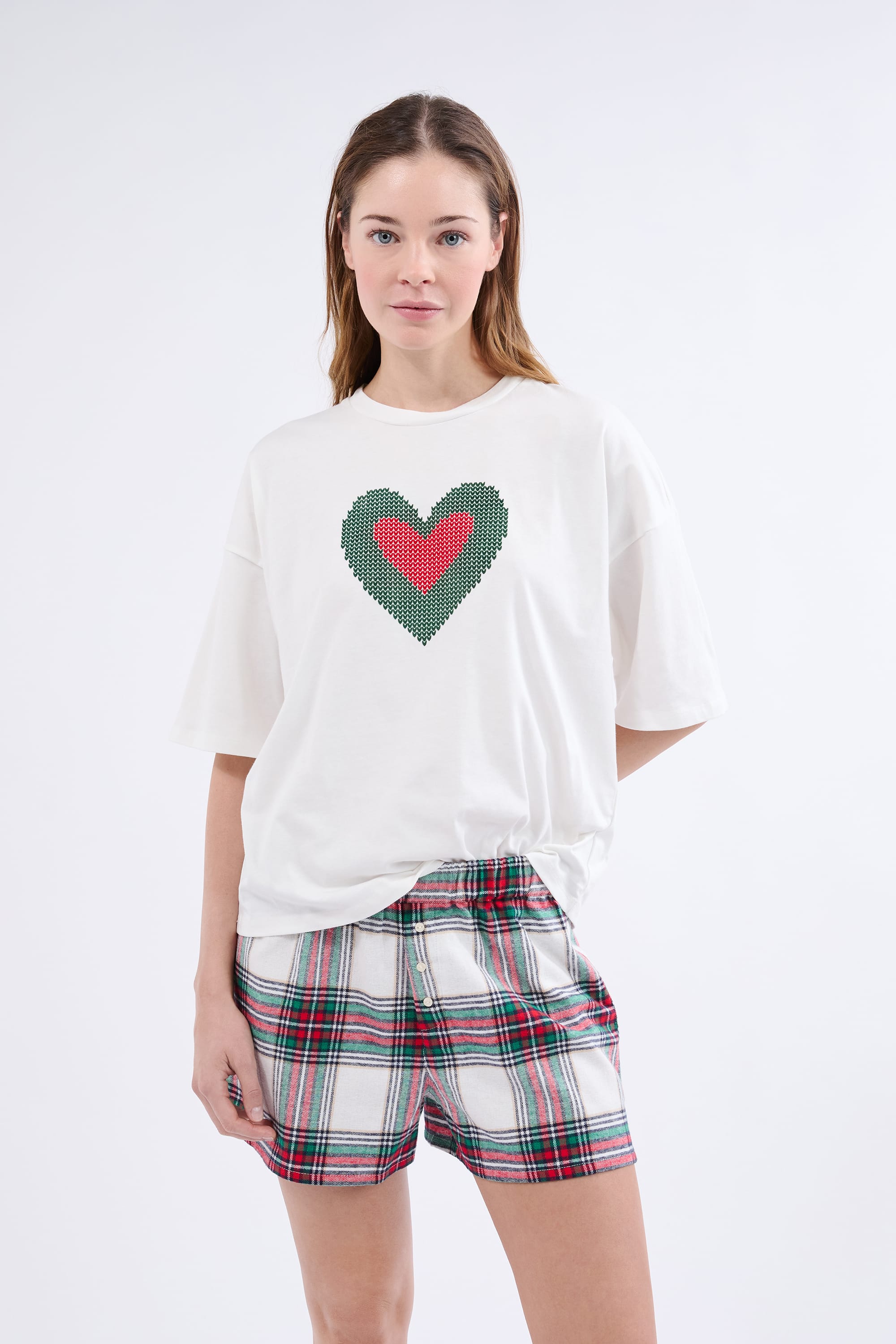 Tout doux et léger, ce pyjama 2 pièces contient un t-shirt manches courtes avec un imprimé cœur. Il se porte avec un short à carreaux.