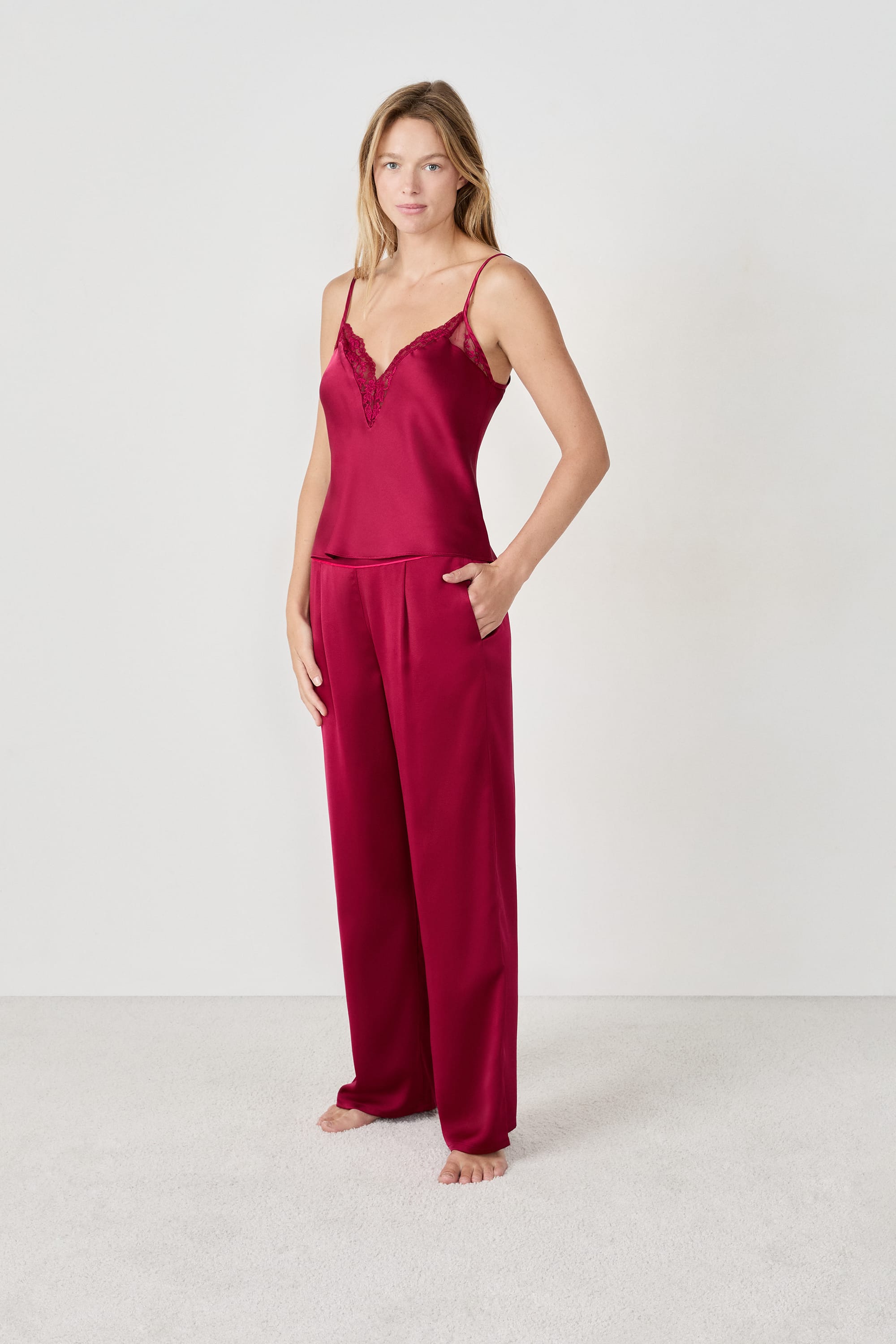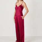 This satin camisole is distinguished by its scalloped lace edges.
