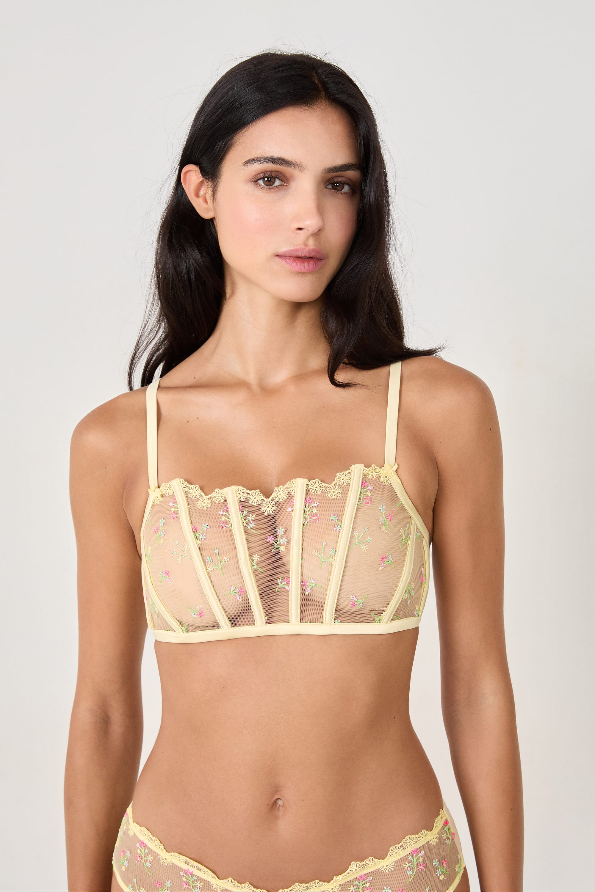 This sheer bustier bra features delicate floral embroidery. Its vertical underwire structure provides support and elegance, combining lightness and sophistication.