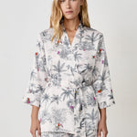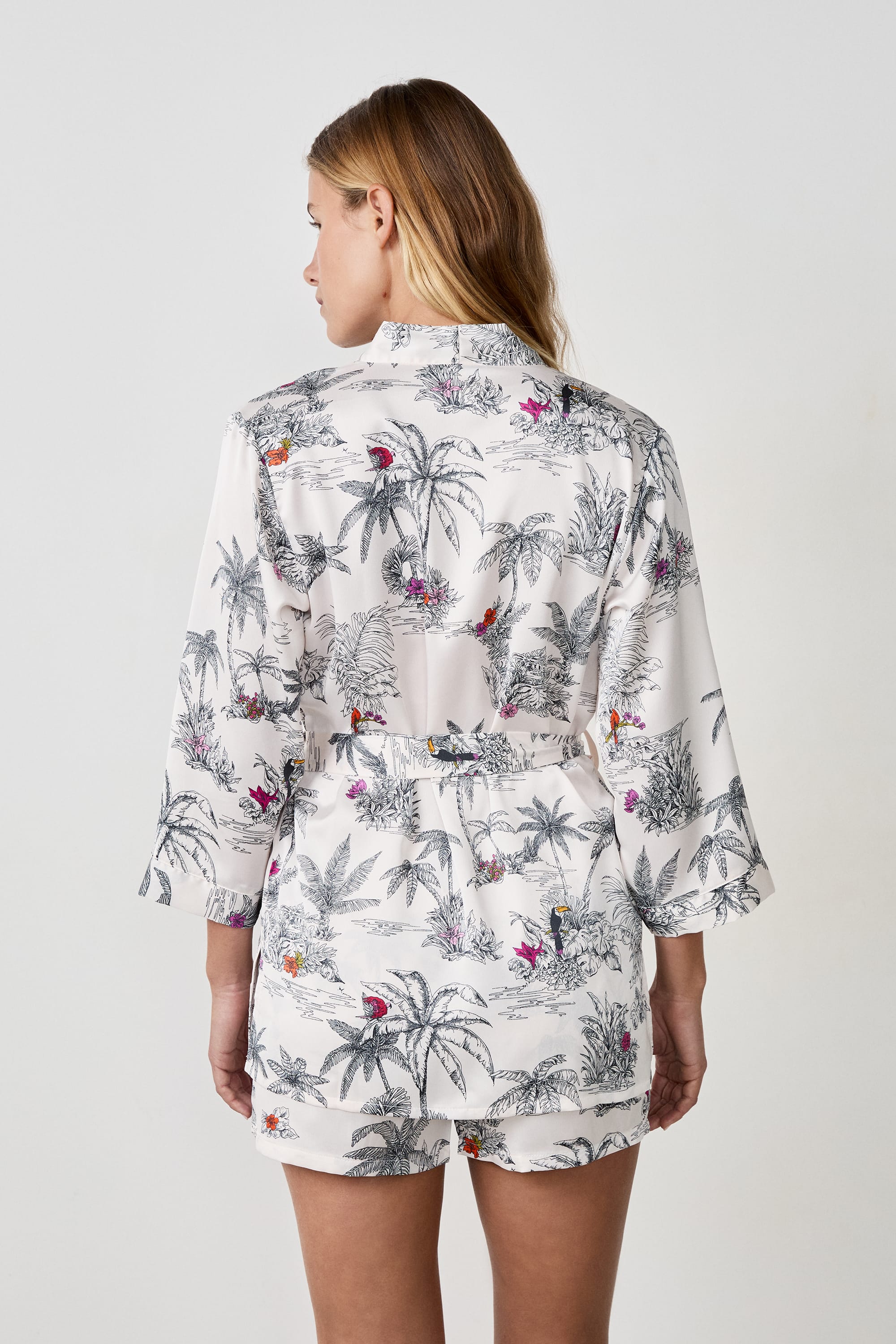 Palm prints elegantly adorn this robe. Equipped with a belt, it structures the silhouette and accompanies your nights with delicacy