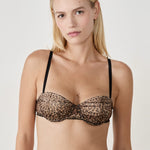 This balconette bra is adorned with delicately pleated tulle. Featuring a leopard print and thin cups, it naturally shapes the bust and adds volume and a modern look.