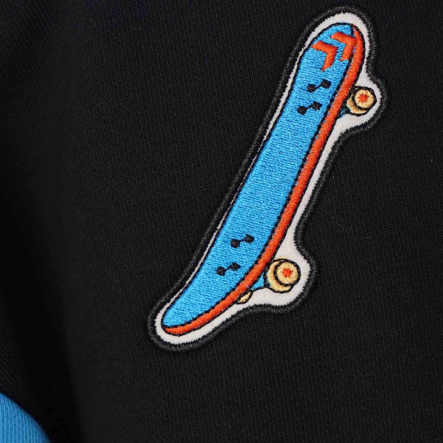 Black HALDOR BOMBER KIDS ZIPPER SWEATSHIRT stands out with its blue panel sleeve details. Logo and artwork accompany the embroidery detail design. Its cotton texture helps the skin breathe. Thanks to its loose fit pattern, it adapts to all sizes. It is useful thanks to its pocket structure. There are snap details on the front.