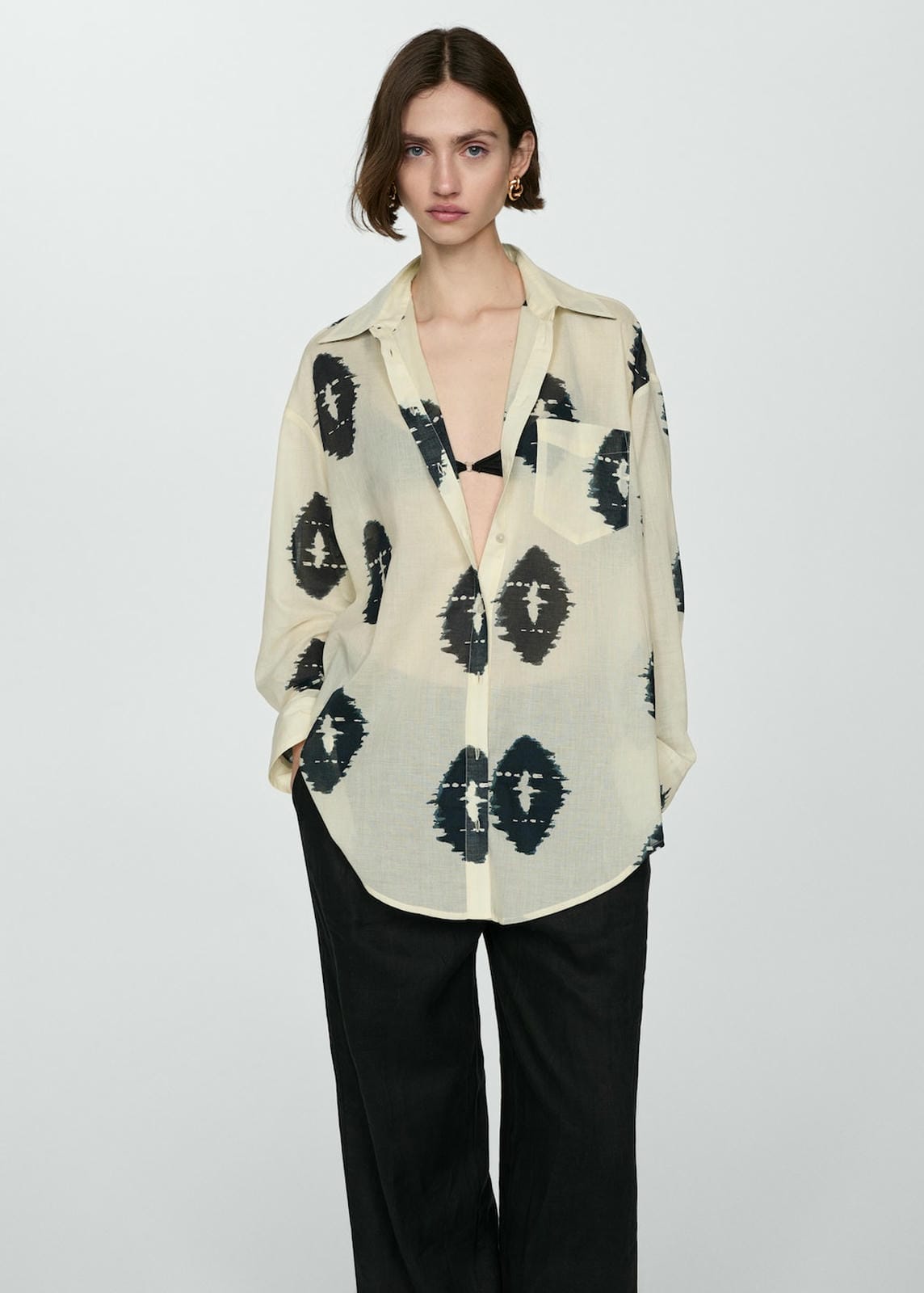 Oversize design. Long design. Semi-transparent design. Shirt-style collar. Long sleeve with buttoned cuffs. Co-ord. Stamped design. 100% cotton fabric. Front closure with buttons. Side length 38.5 cm. Back length 81.5 cmProduct Code: 77040354-05