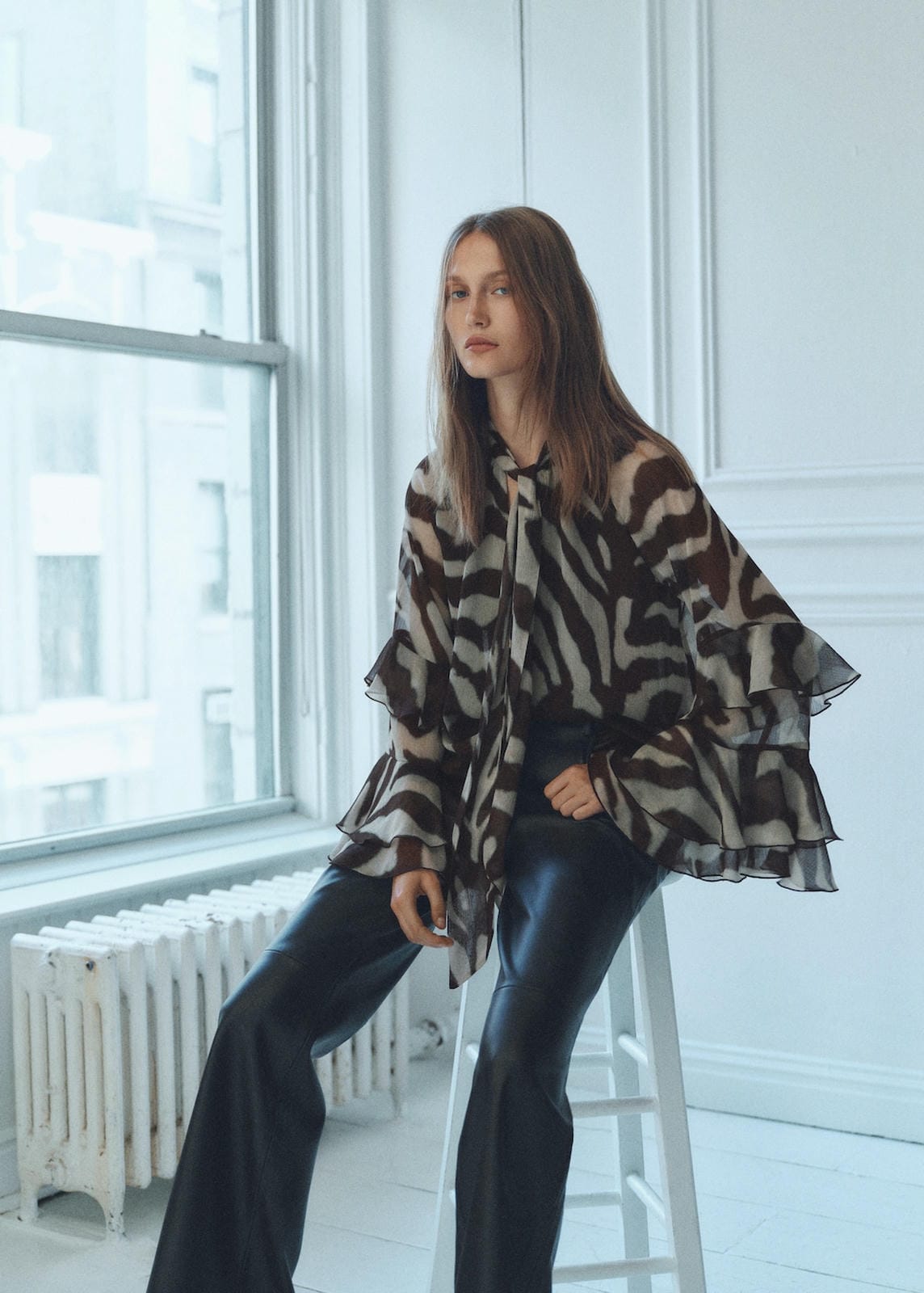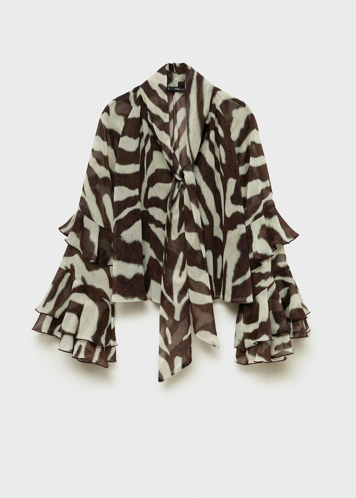 Fluid fabric. Straight Design. Animal print. Two-tone print. V-neck with bow. Long flared sleeve. Ruffle details. No fasteningProduct Code: 87030652-30