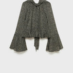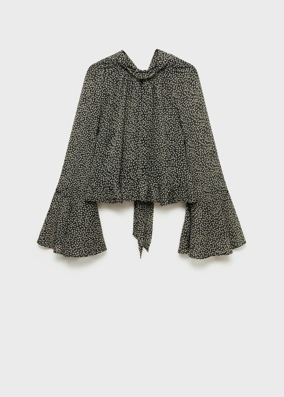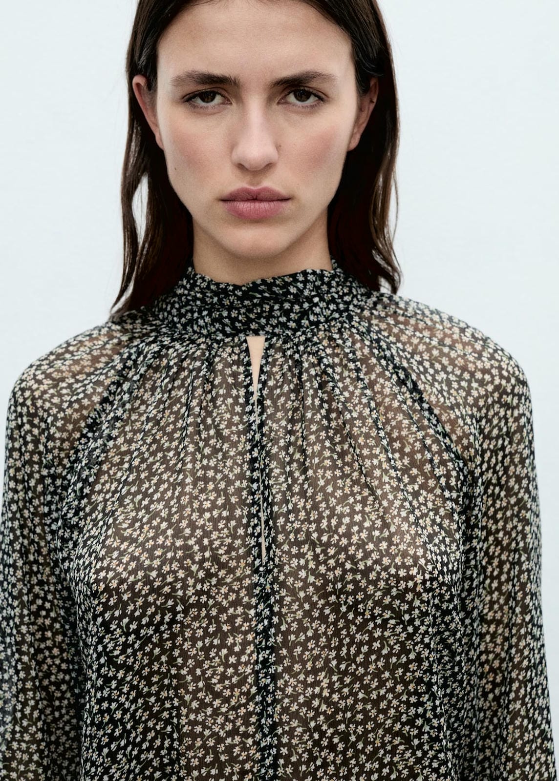 Gauze fabric. Semi-transparent design. Flowers print. Turtleneck. Opening at the neck. Long sleeve with ruffle. Ruffles on the hem. Bow fastening on the neck. Side length 29.3 cm. Back length 55.7 cmProduct Code: 87065739-99