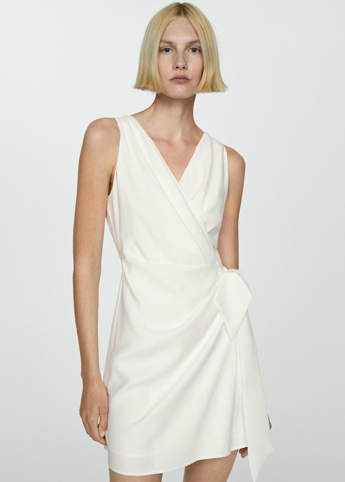 Flowy fabric. Short design. Straight design. Wrap neckline. Sleeveless. Crossed bow closure. Inner lining. Plus Size Available. Side length 78.1 cm. Back length 85.3 cmProduct Code: 77040366-02
