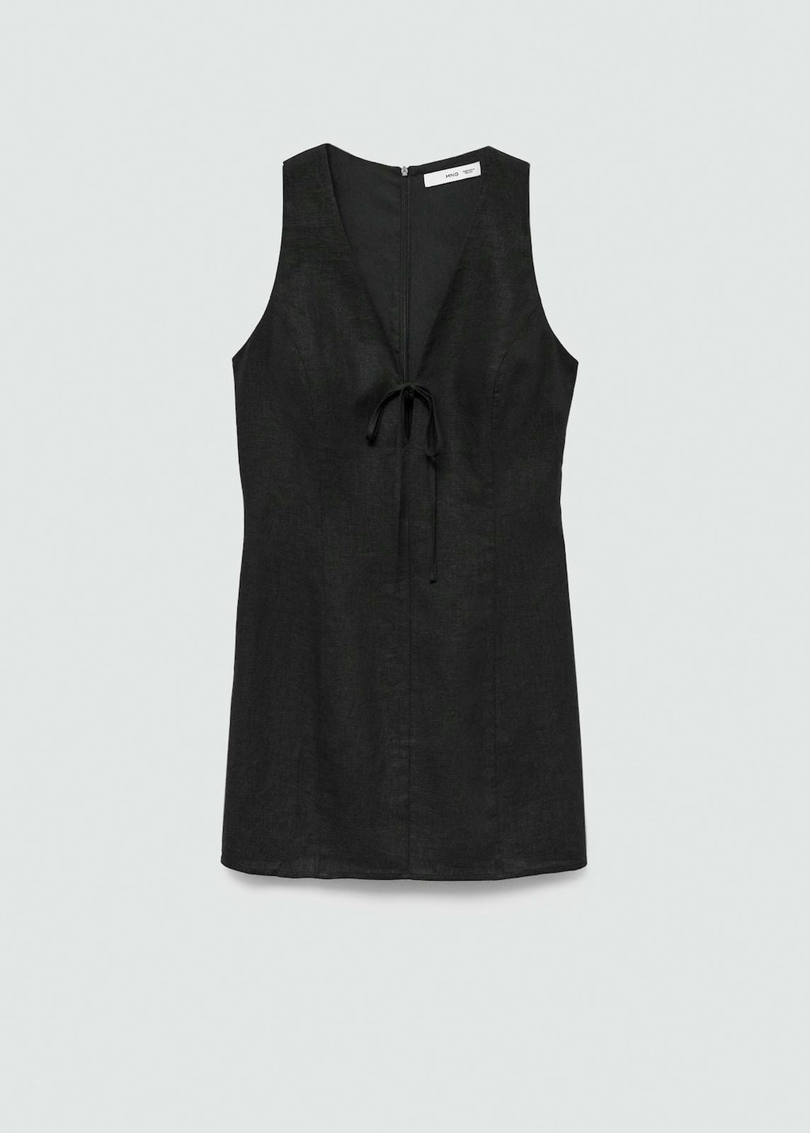 Linen mix. Short design. Straight design. V-neck. Sleeveless. Wide straps. Invisible back zip fastening. Decorative bow. Inner lining. Plus Size Available. Side length 72.6 cm. Back length 97.6 cmProduct Code: 77042925-99