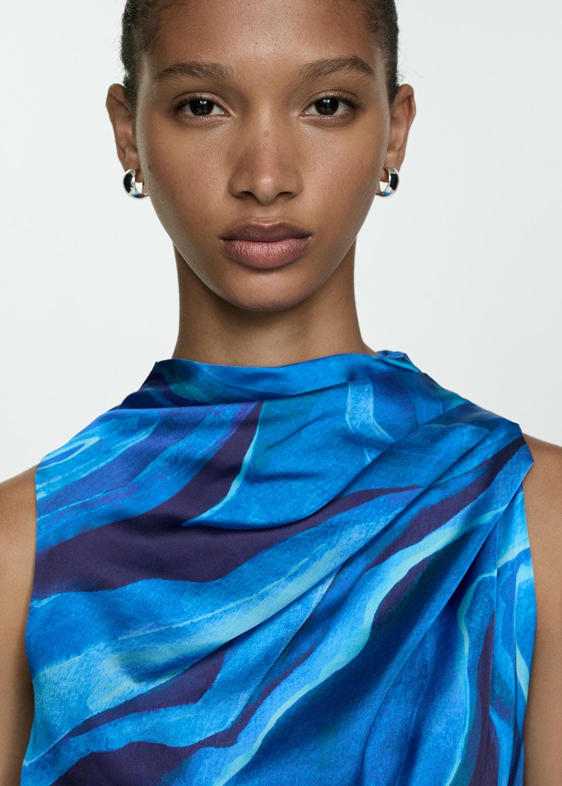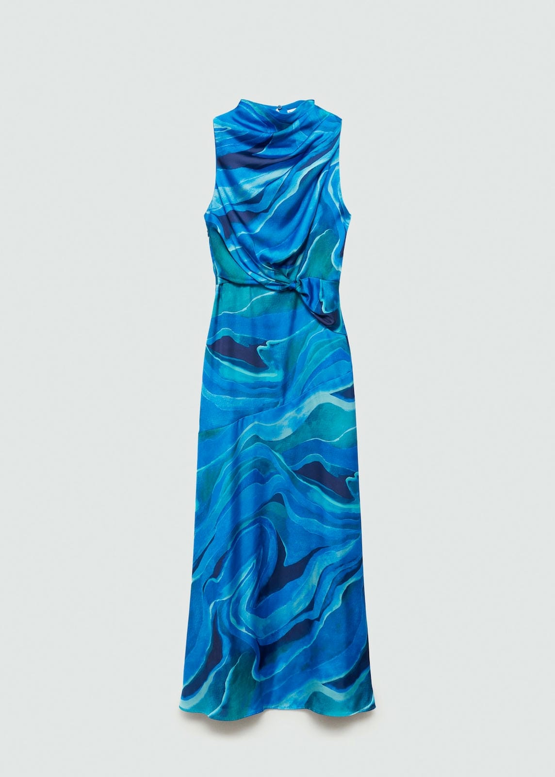 Satin. Flowy fabric. Long design. Evasé design. Turtleneck. Draped neck. Sleeveless. Invisible back zip fastening. Knot detail. Party and events collection. Stamped design. Side length 119.0 cm. Back length 152.3 cmProduct Code: 77044063-52