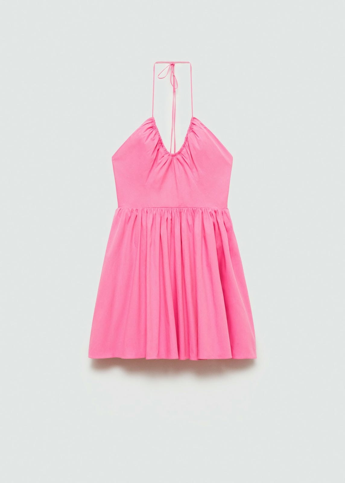 Evasé design. Short design. Ruched neck. Thin straps. Open back. Elastic gathered section. Side zip fastening. 100% cotton fabric. Back length 64.7 cmProduct Code: 77020384-85