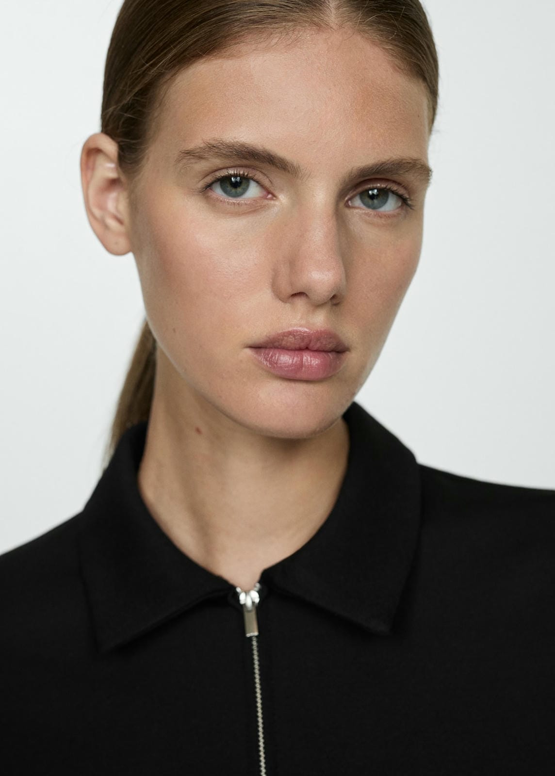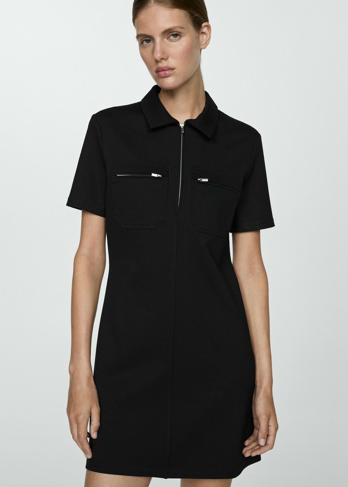 Flowy fabric. Short design. Straight design. Polo neck. Short sleeve. Two chest pockets with zippers. Zip fastening on the front section. The model is 180 cm and is wearing a size S. Side length 69.5 cm. Back length 95.1 cmProduct Code: 77074039-99
