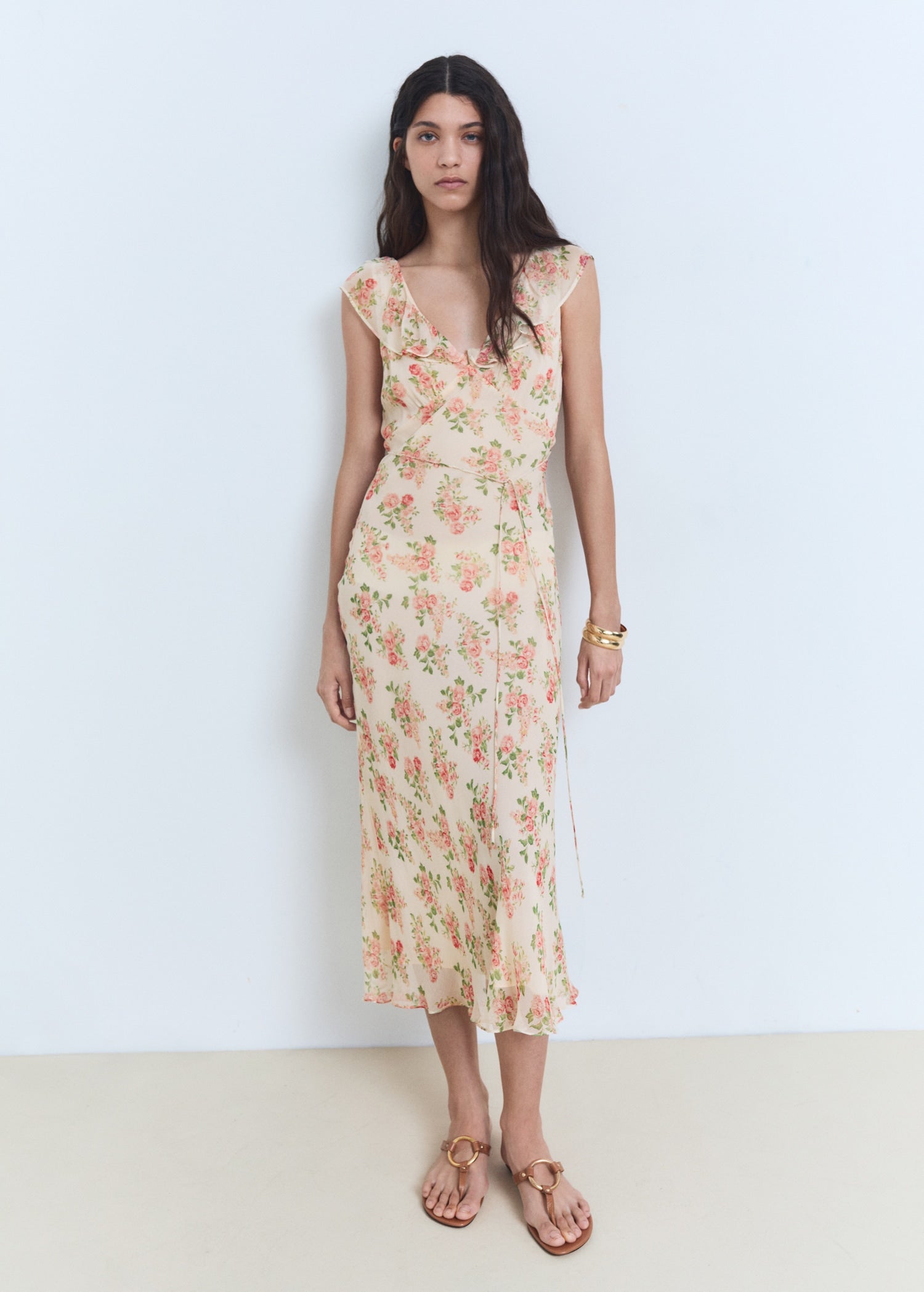 Straight Design. Midi design. Floral print. V-neck. Sleeveless. Ruffles detail on the neck. Bow belt at the waist. Zip fastening on the back section. Inner lining.Product Code: 87019069-05