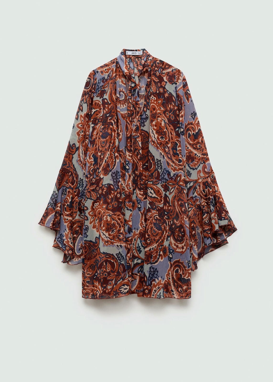 Light fabric. Evasé design. Short design. Round neck. Bow at the neck. Long sleeve. Ruffles on the sleeves. Front closure. Inner lining. The model is 1.76 tall and is wearing a size 36. Removable belt. Side length 67.6 cm. Back length 95.9 cm. Light fabric, evasé design, short design, rounded neck, bow at the neck, long sleeve, ruffles on the sleeves, front closure, removable belt, inner lining, the model is 1.76 tall and is wearing a size 36.Product Code: 77075672-30