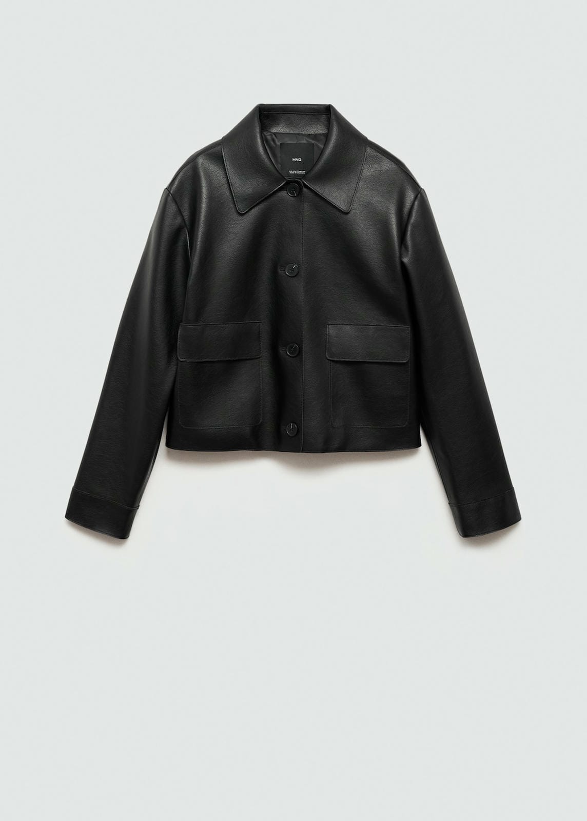Short design. Straight design. Faux leather. Shirt-style collar. Long sleeve. Two front flap pockets. Inner lining. The model is 180 cm and is wearing a size S. Front closure with buttons. Side length 29.7 cm. Back length 56.2 cmProduct Code: 77034789-99