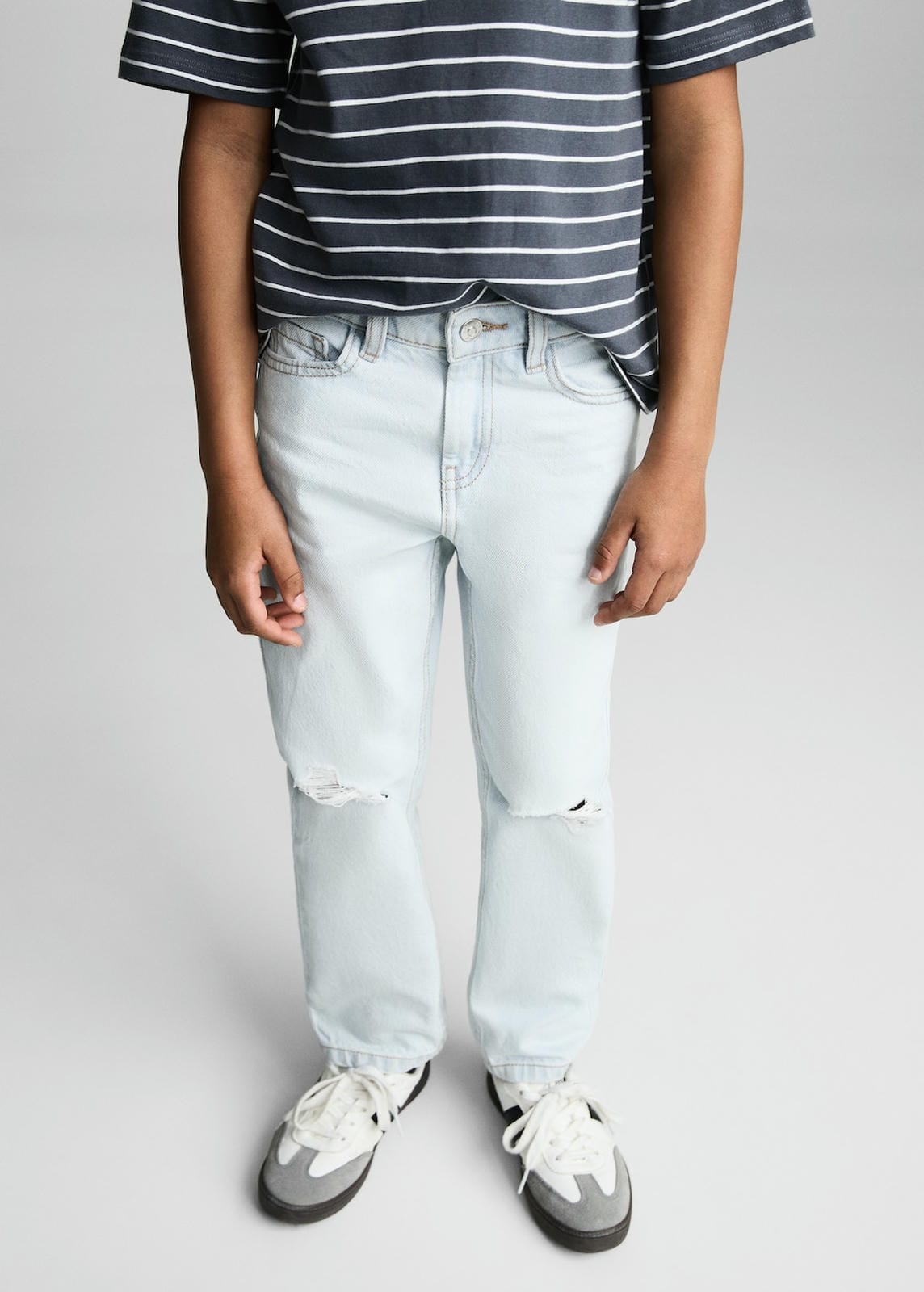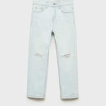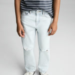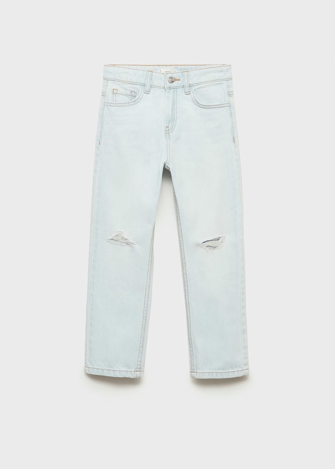 Denim style cotton fabric. Straight Design. Long design. Five pockets. Medium waist. Decorative rips. Zip and one button fastening. Loops on the waist. Side length 93.0 cmProduct Code: 87002900-TC