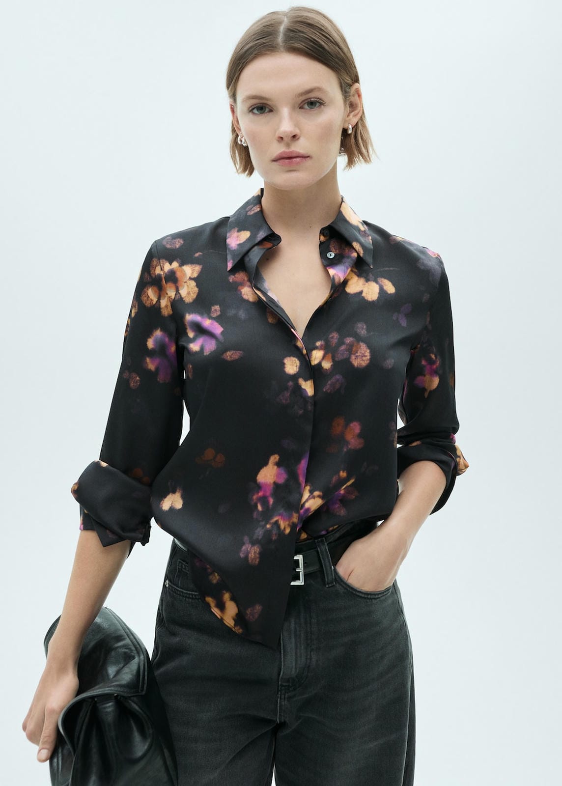 Satin. Flowy fabric. Straight design. Stamped design. Shirt-style collar. Long buttoned sleeves. Button fastening on the front section. The model is 1.80 cm tall and is wearing a size 36. Side length 36.5 cm. Back length 65.6 cmProduct Code: 77077720-65