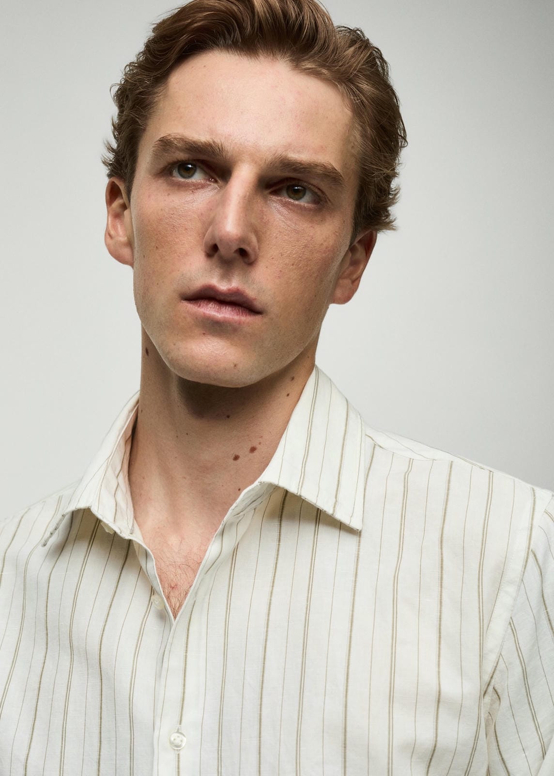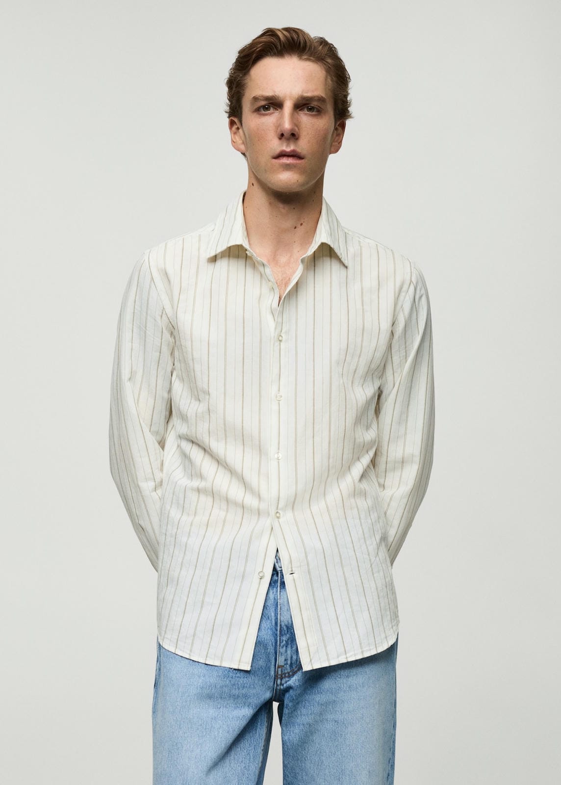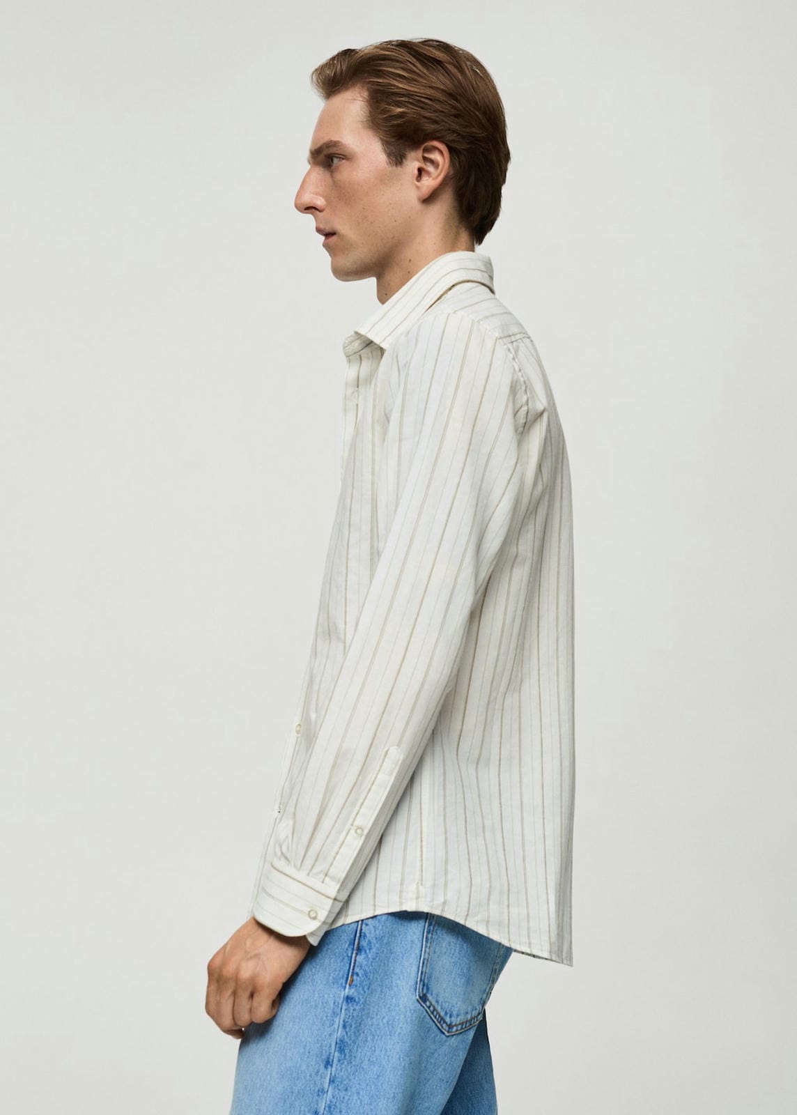 Regular fit. Cotton and linen mix. Vertical striped print. Shirt-style collar. Button fastening on the front section. Long sleeve with buttoned cuffs. The model is 185 cm tall and is wearing a size M. Rounded base. Side length 44.6 cm. Back length 79.0 cmProduct Code: 77022538-37