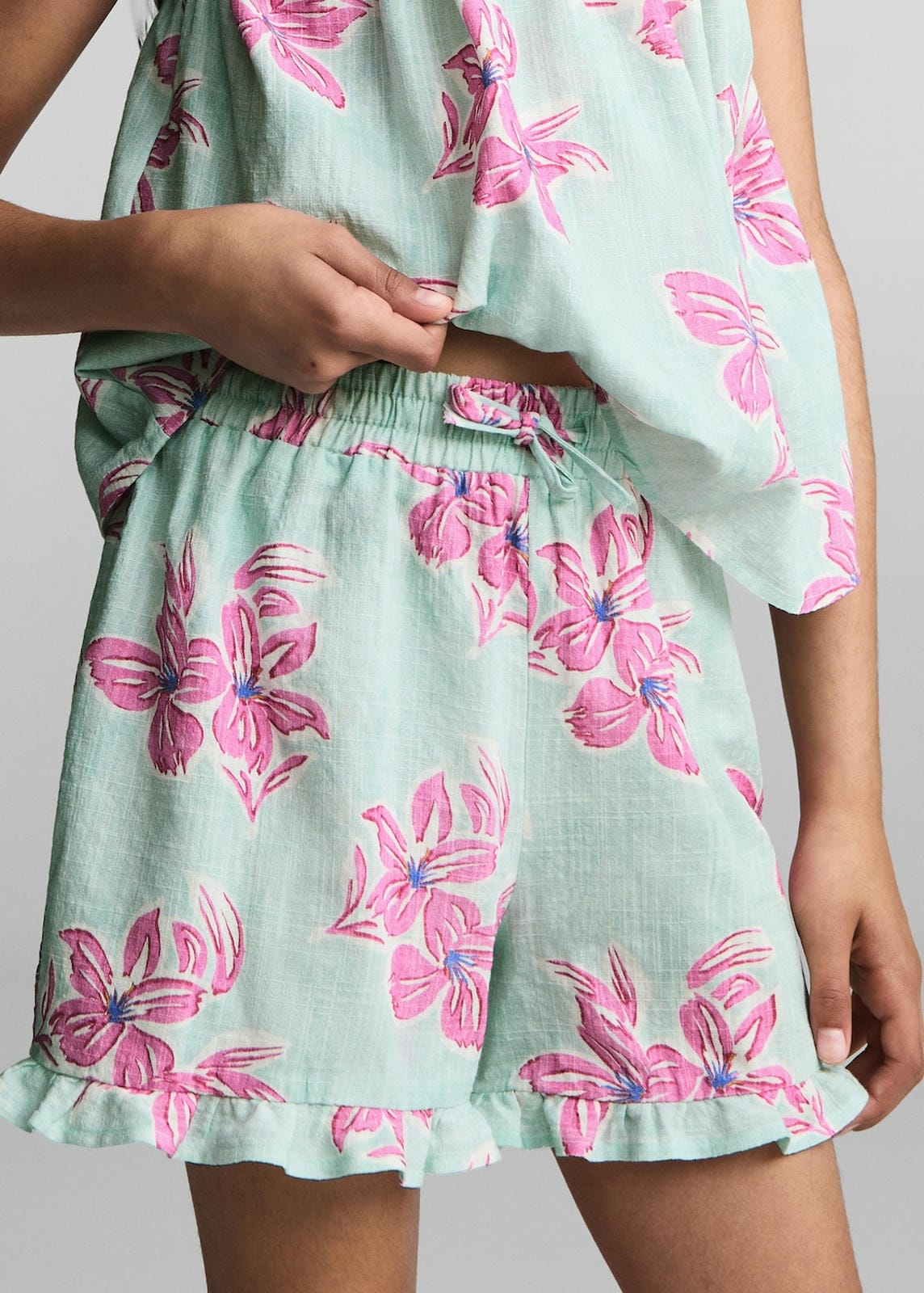 Cotton fabric. Flowers print. Straight design. Short design. Ruffle details. Elasticated waist. Adjustable drawstring closure. Side length 34.5 cmProduct Code: 77090374-46