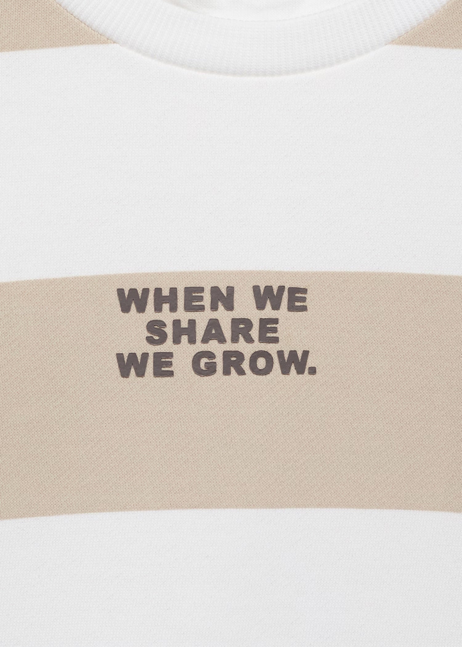 100% cotton fabric. Striped fabric. Straight Design. Round neck without hood. Long sleeves. Ribbed collar, cuffs and hem. Printed text on the front.