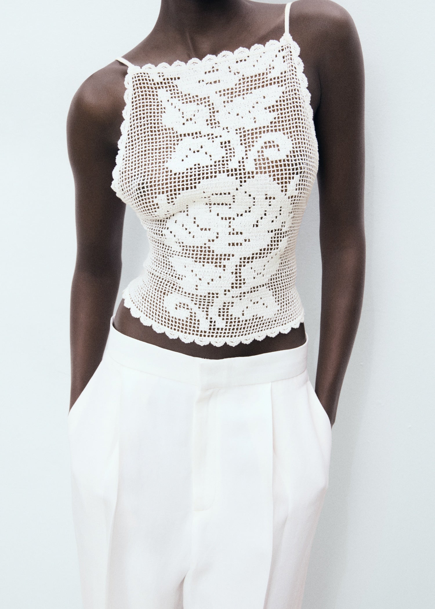 Crafted in crochet fabric, this fitted sleeveless design features thin straps and an open back with a bow closure, offering a unique and sophisticated style.Product Code: 17081194-02