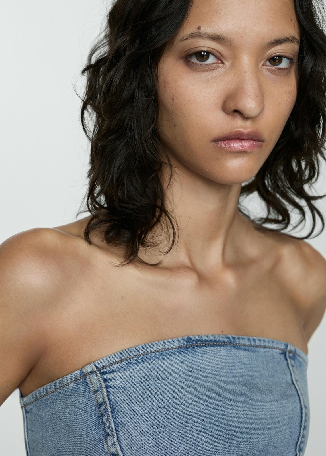 Denim style cotton fabric. Strapless. Sleeveless. Side zip fastening. Fitted designProduct Code: 77060376-TM