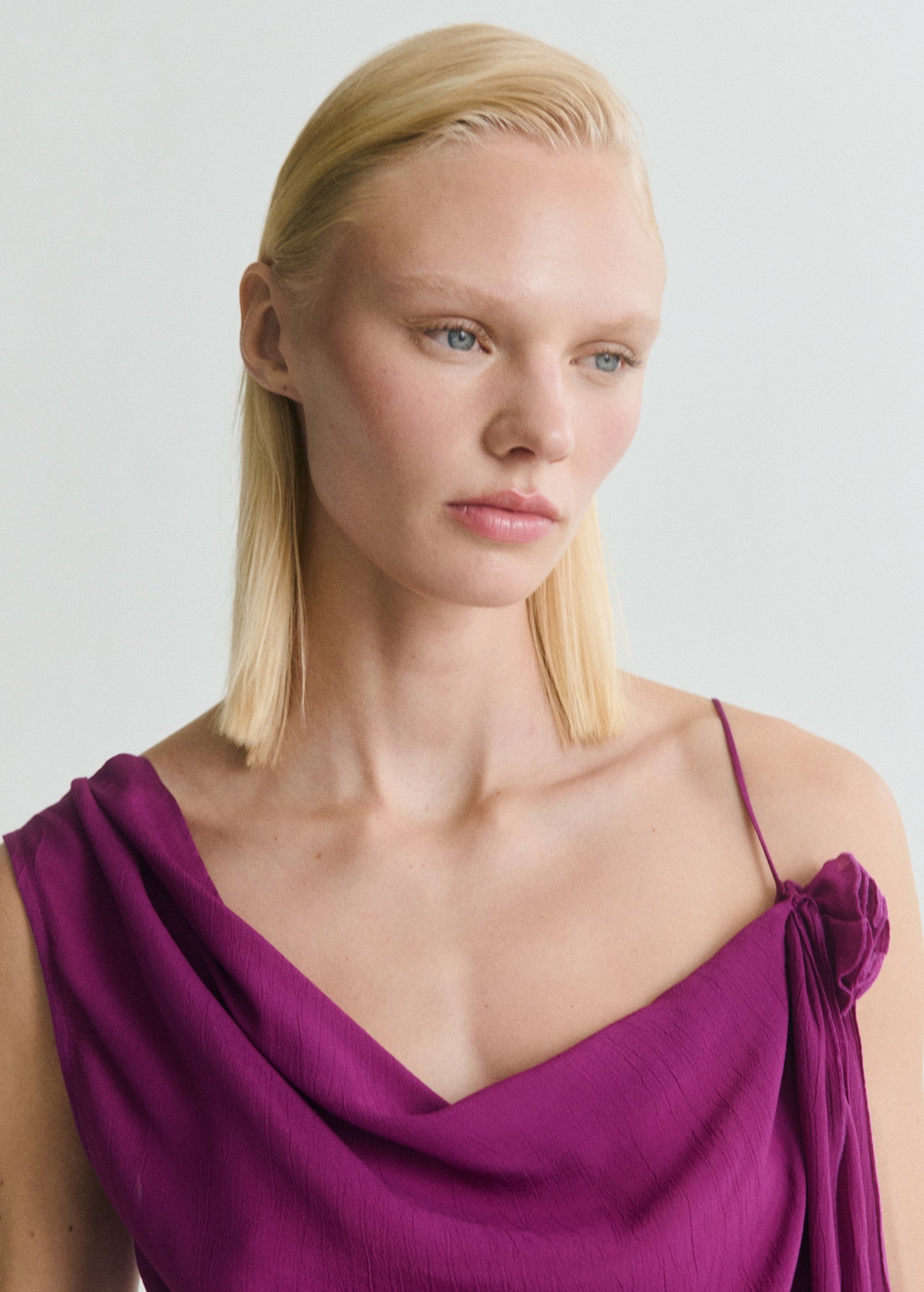 Straight Design. Long design. Draped neckline. Short sleeves. Thin strap. Flower detail. Side button fastening. Total look. This garment belongs to our event collection, designed to make you the perfect guest at any party, wedding or ceremony.Product Code: 87008657-65