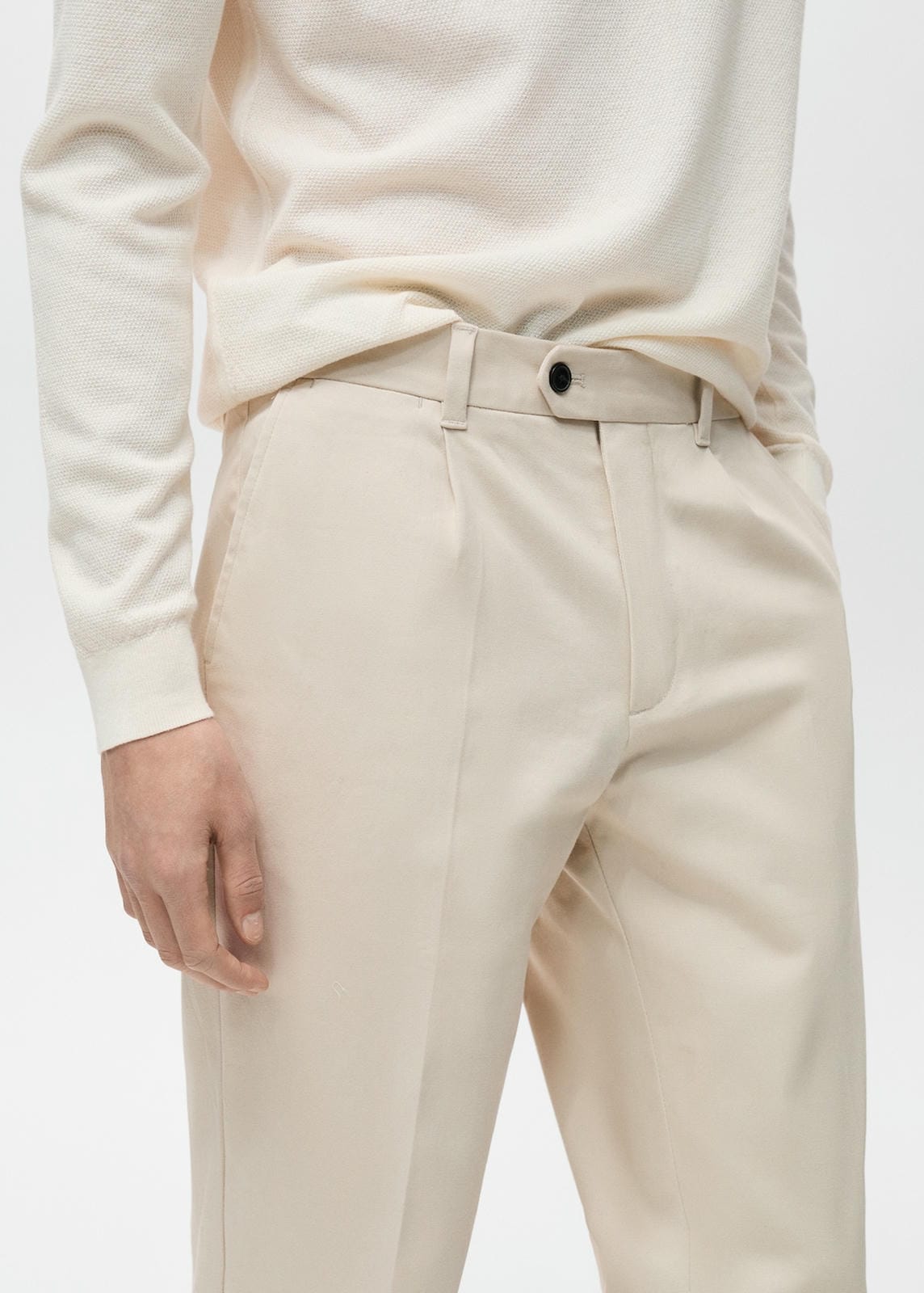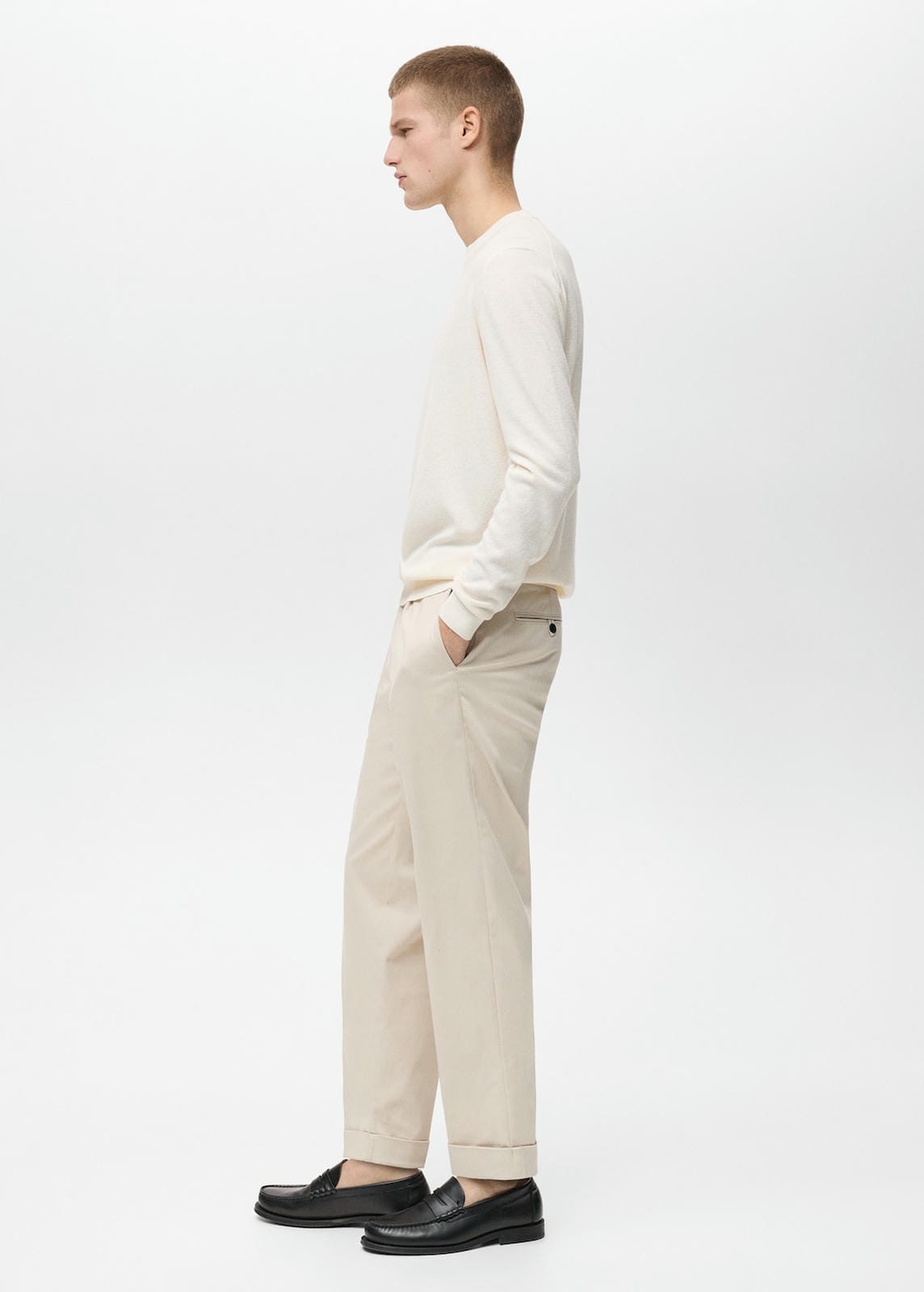 Regular fit. Cotton fabric. Ironed stripe detail at front and back. Belt loops. Double button fastening. Cuffed hem. The model is 185 cm tall and is wearing a size 42. Two welt pockets with button at the back. Inside leg measurement 76.4 cm. Side length 105.0 cmProduct Code: 87030579-08
