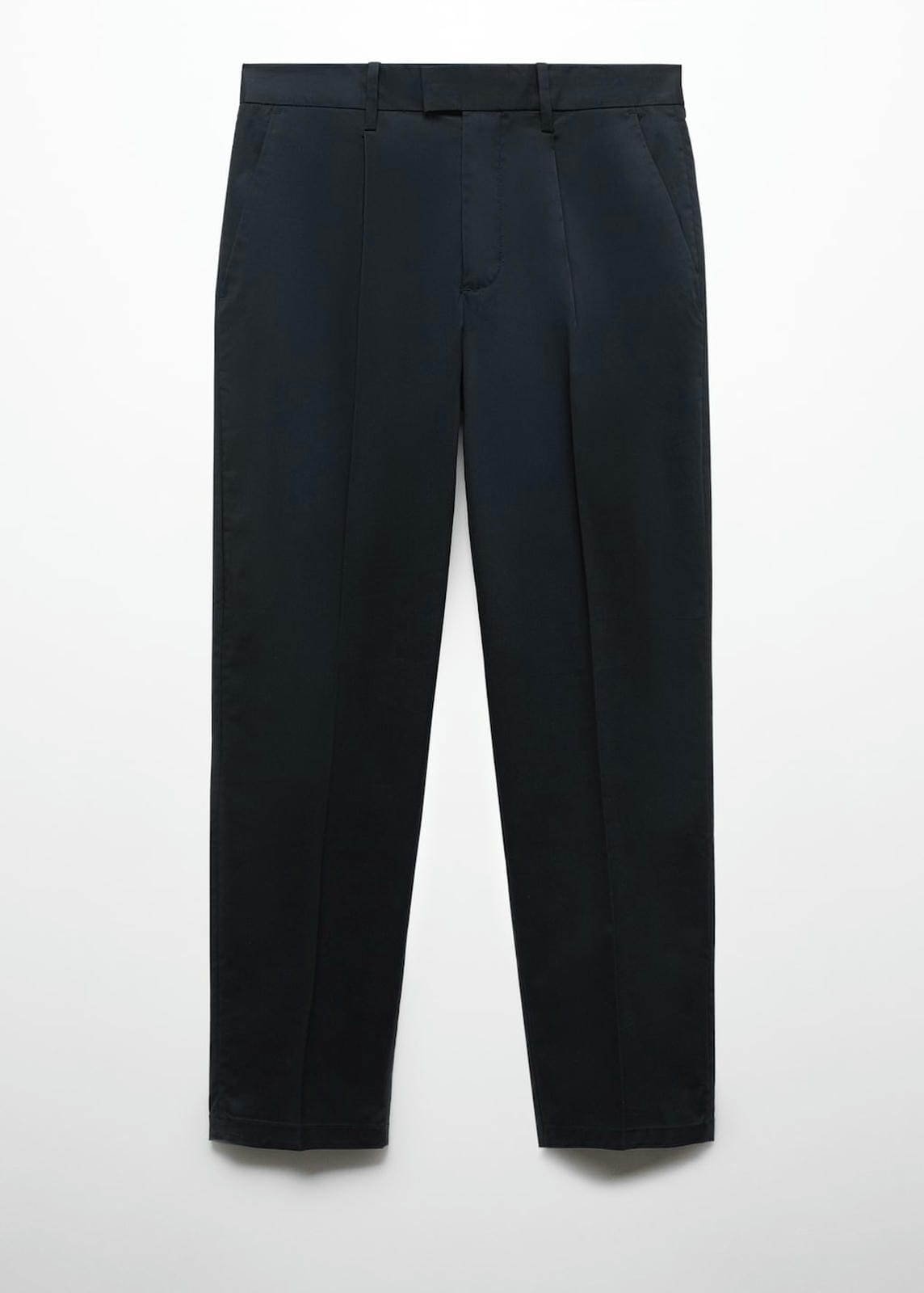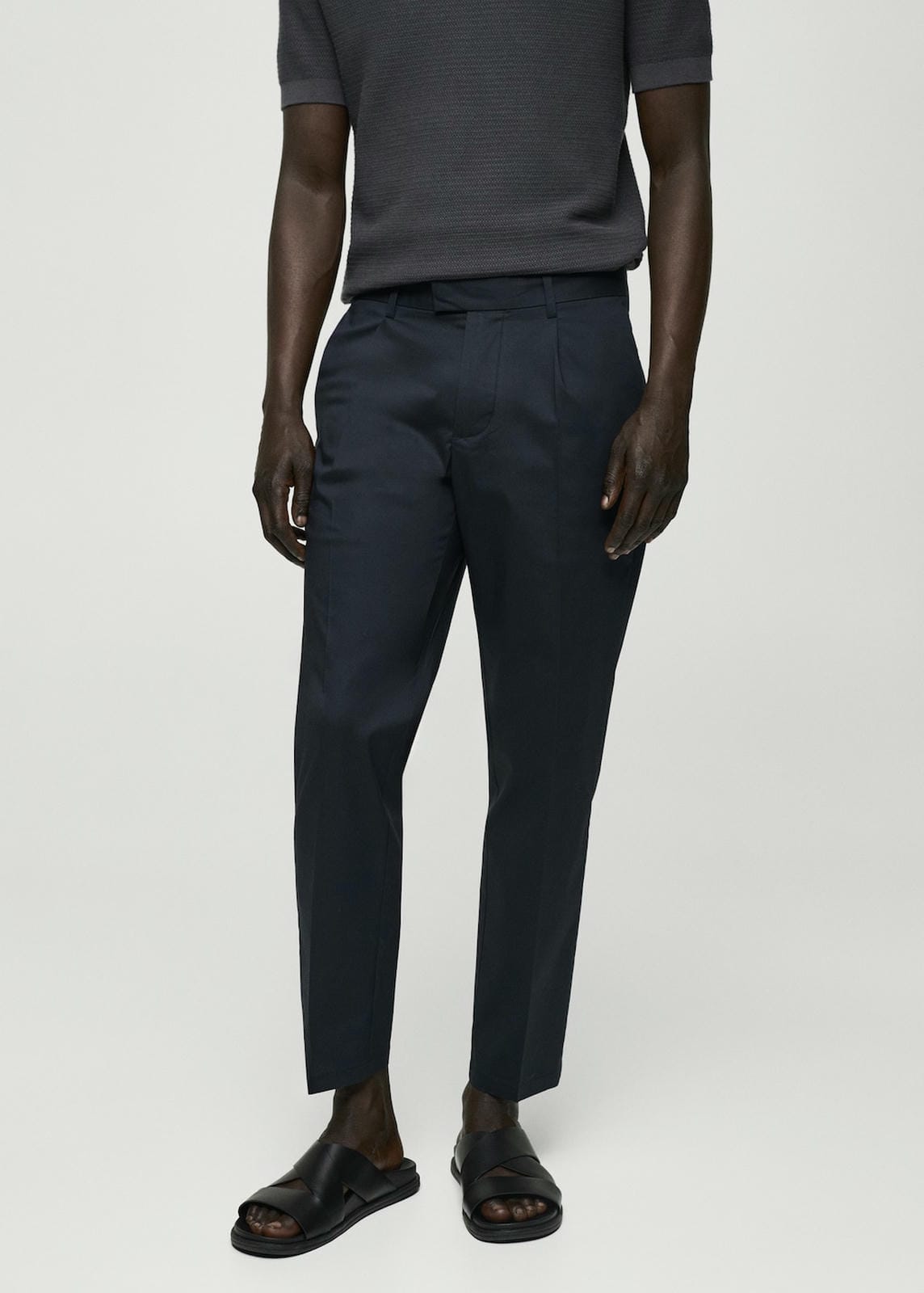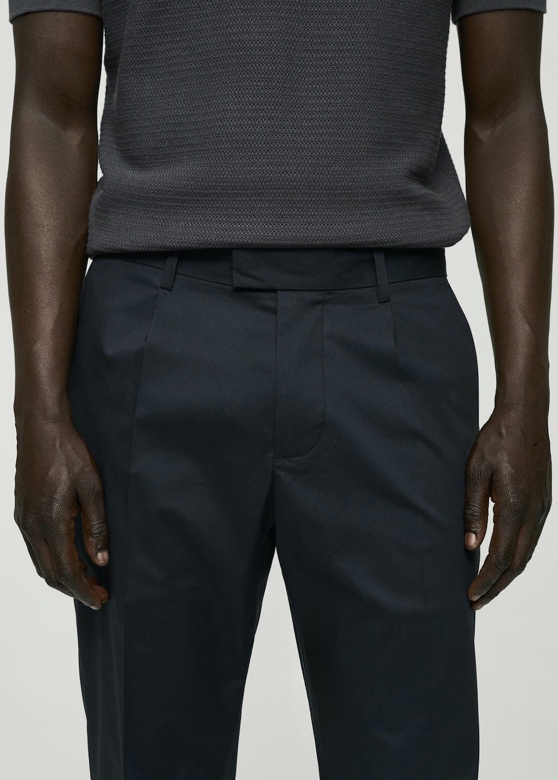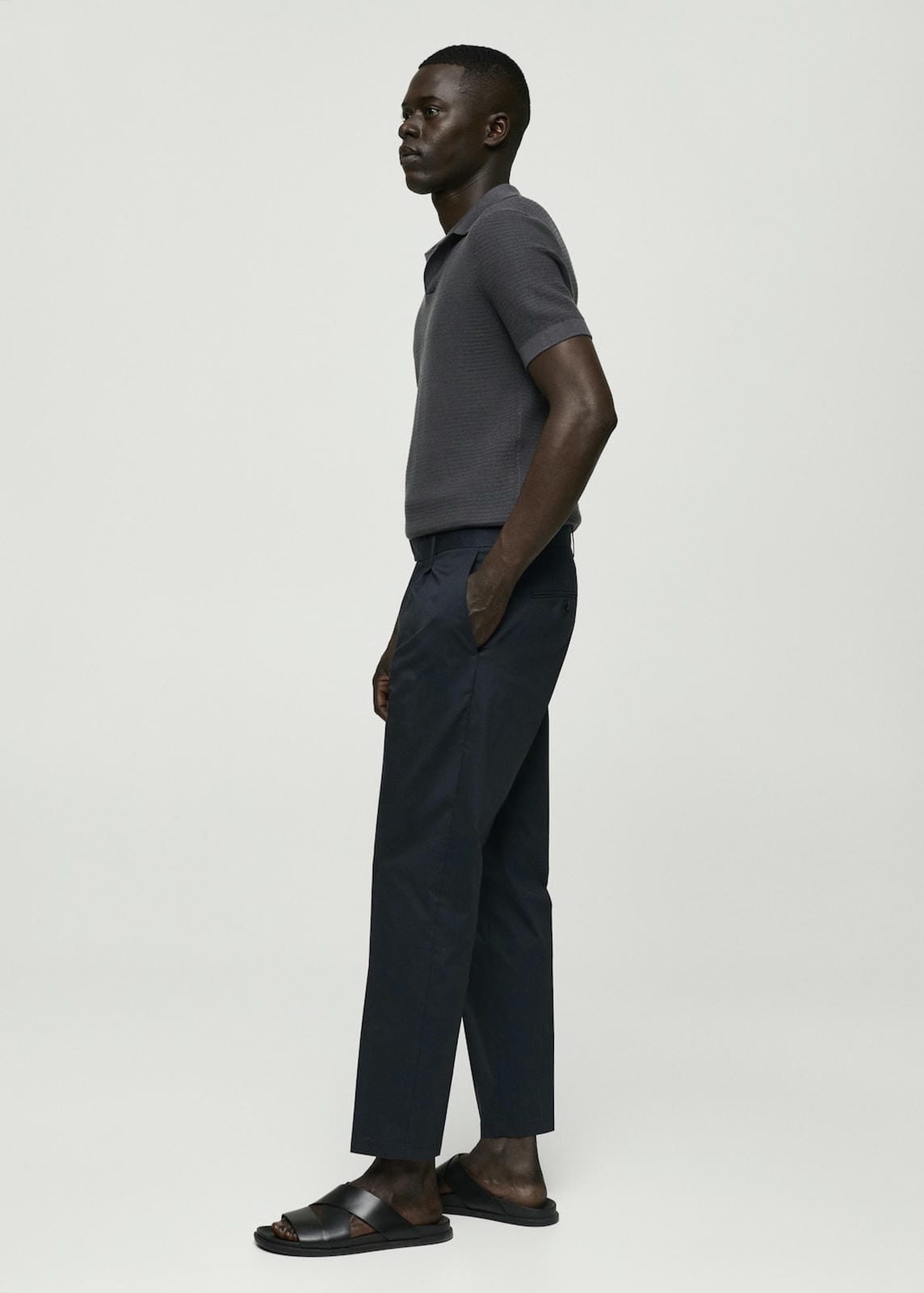 Slim fit. Medium waist. Cotton-blend fabric. Detail of front calipers. Belt loops. Double-breasted and zipped front closure. Two front pockets. Two button-up welt pockets on the back. The model is 185 cm tall and is wearing a size 42. Ironed stripe detail at front and back. Inside leg measurement 75.4 cm. Side length 103.0 cmProduct Code: 77010571-57