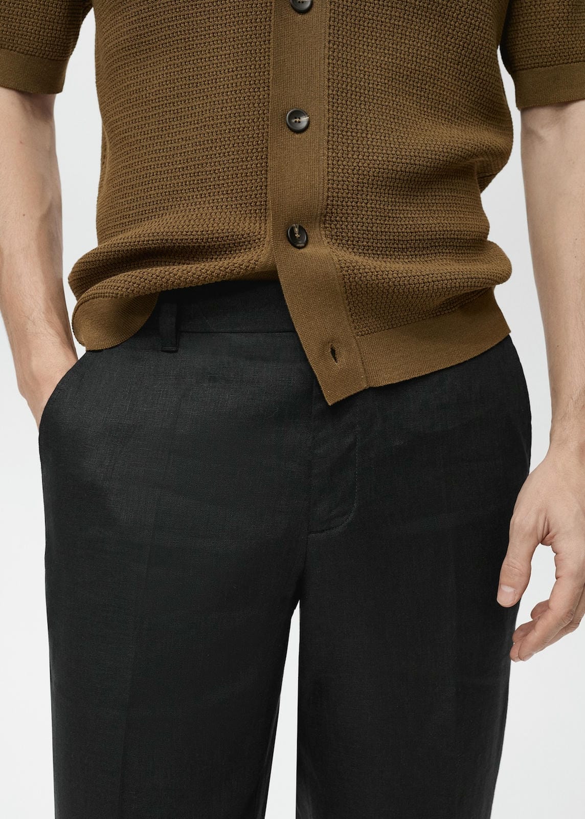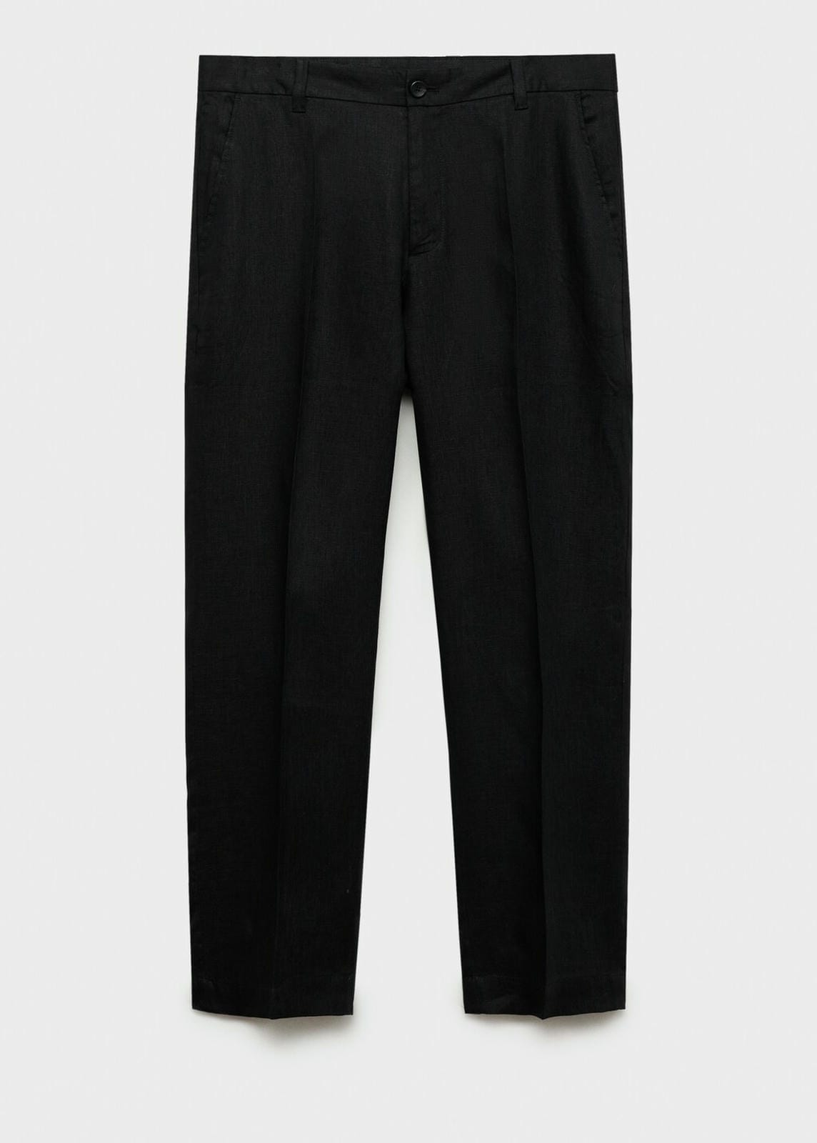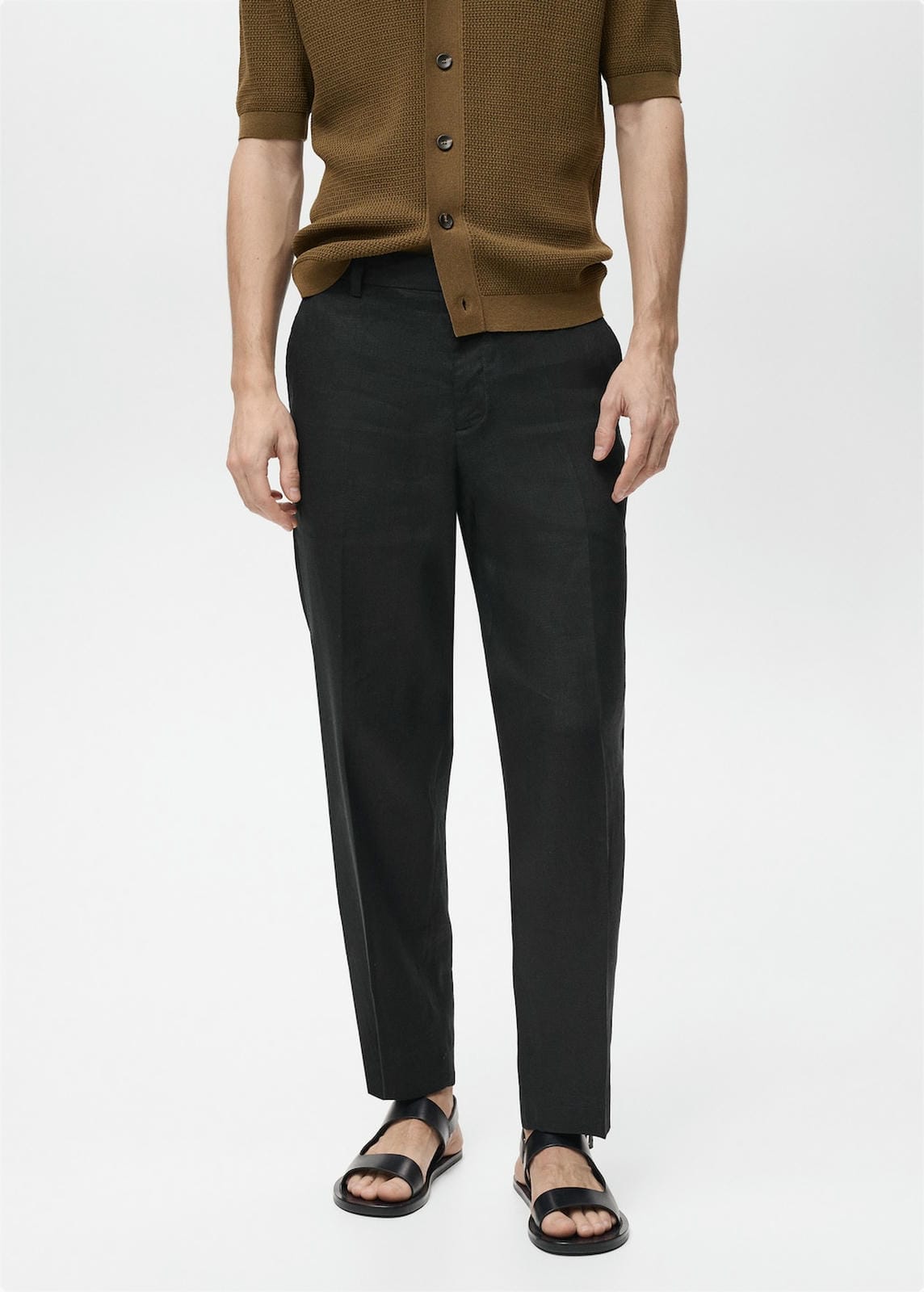 100% linen fabric. Regular fit. Belt loops. Front fastening with double-breasted buttons and zip. Two side pockets. Two welt pockets and button on the back. Ironed stripe detail at front and back. The model is 190 cm tall and wears a size 42.Product Code: 87035921-99