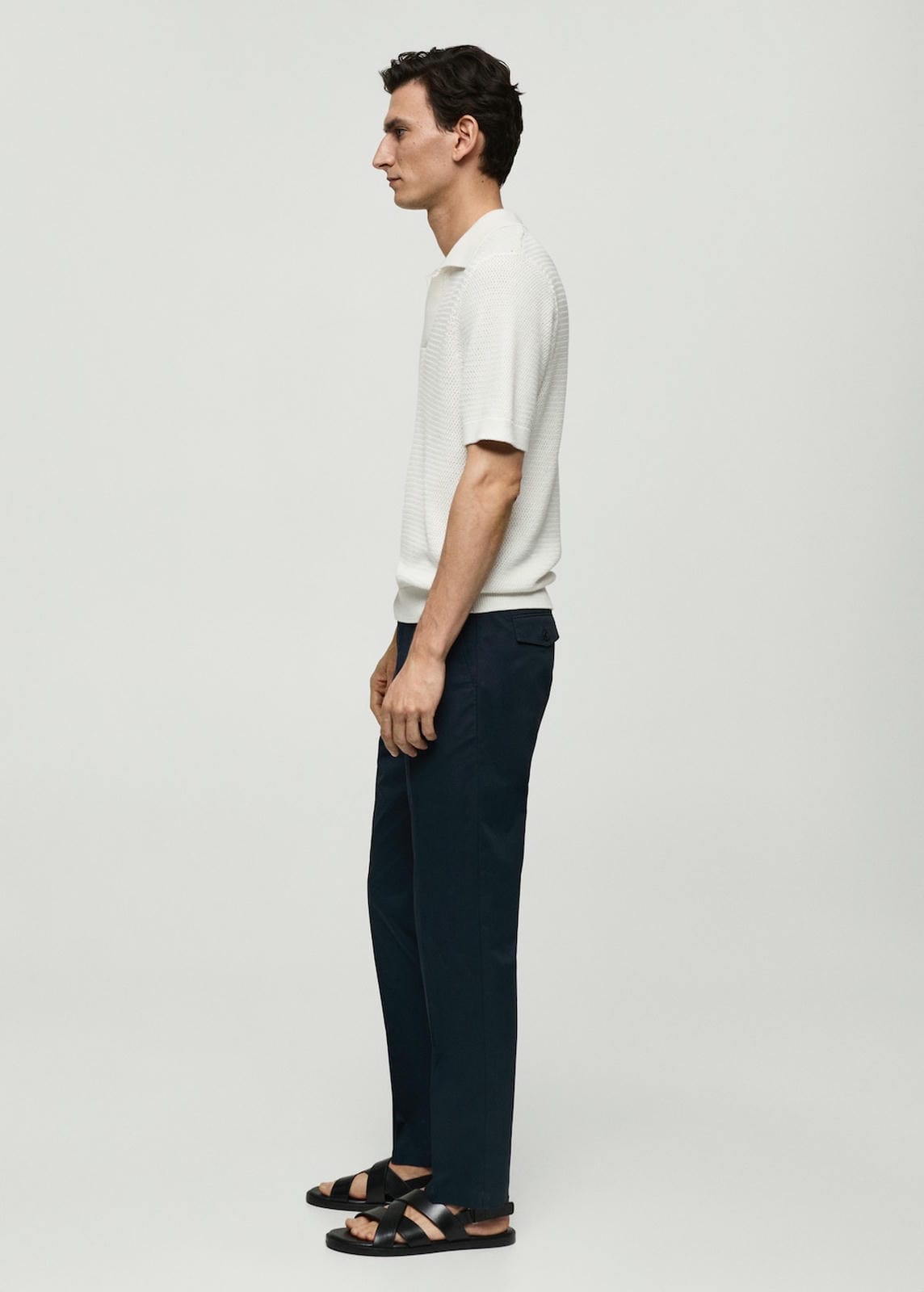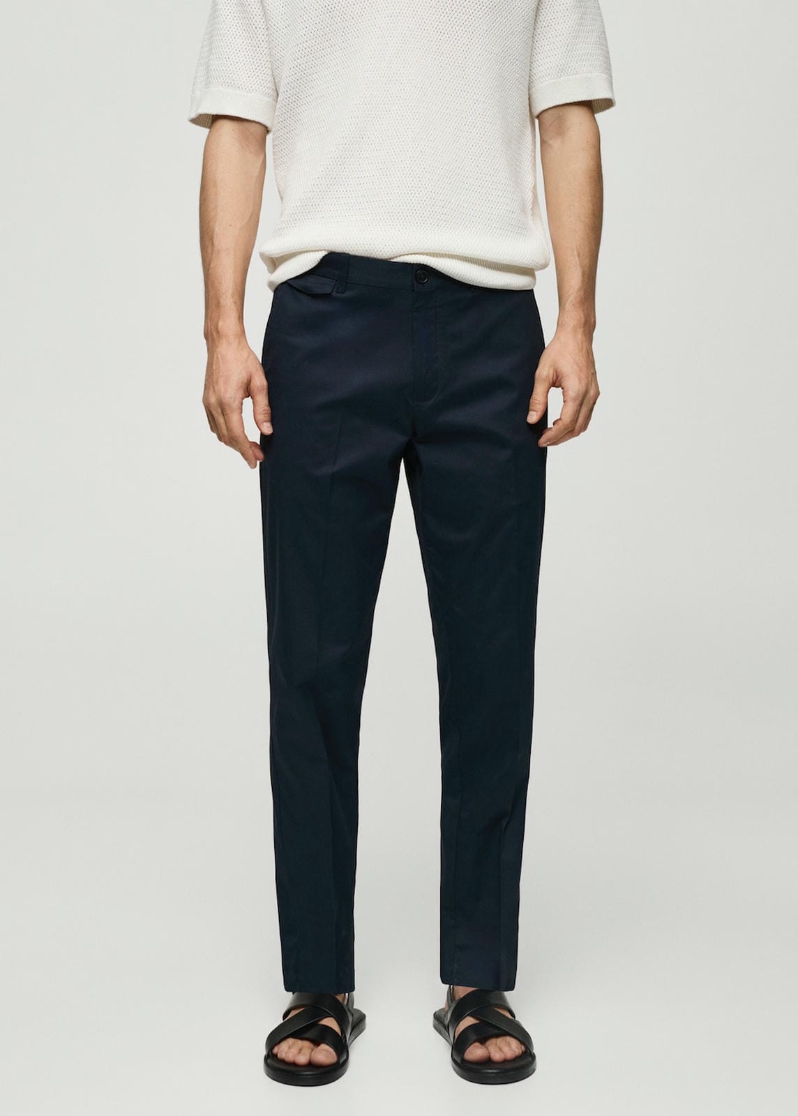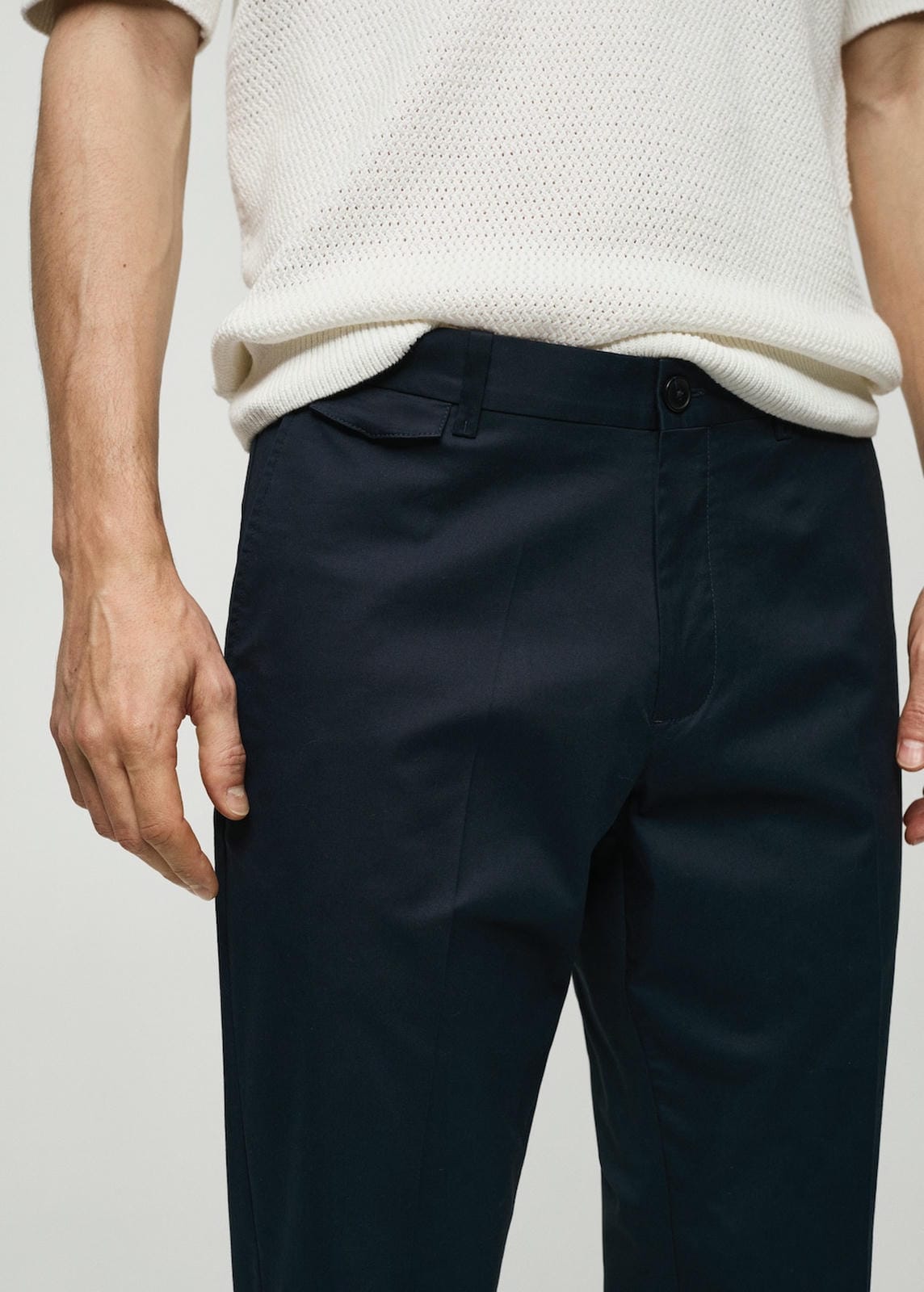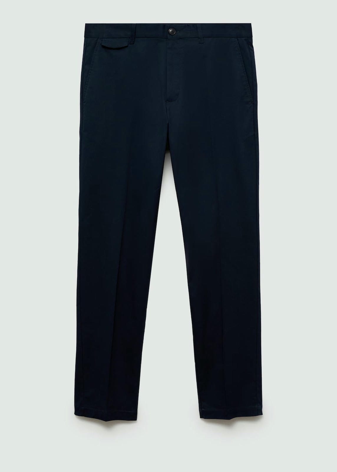 Regular fit. Medium waist. Cotton fabric. Belt loops. Double-breasted and zipped front closure. Two front pockets. Coin pocket at hip height. Two pockets with buttoned flaps on the back. The model is 185 cm tall and is wearing a size 42. Ironed stripe detail at front and back. Inside leg measurement 79.4 cm. Side length 107.0 cm. Regular fit, medium waist, cotton fabric, belt loops, double-breasted and zipped front closure, ironed stripe detail at front and back, two front pockets, coin pocket at hip height, two pockets with buttoned flaps on the back, the model is 185 cm tall and is wearing a size 42.Product Code: 77001010-56