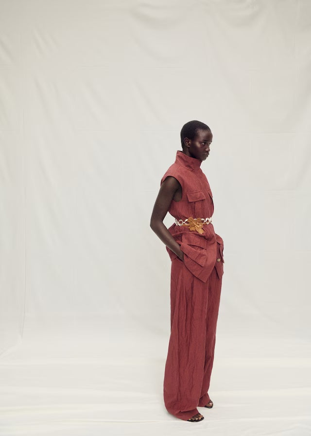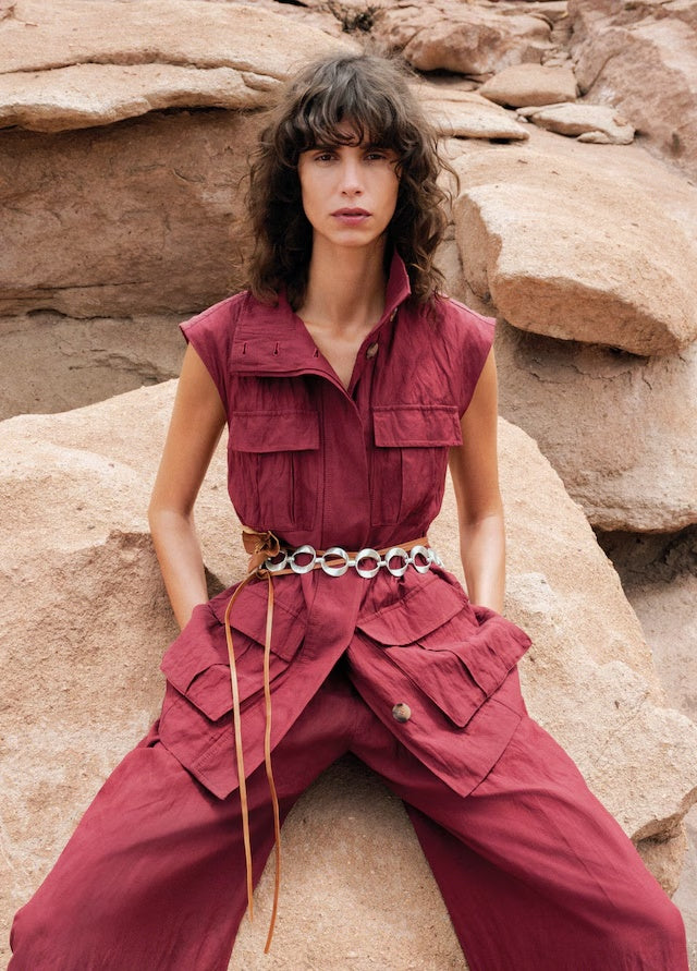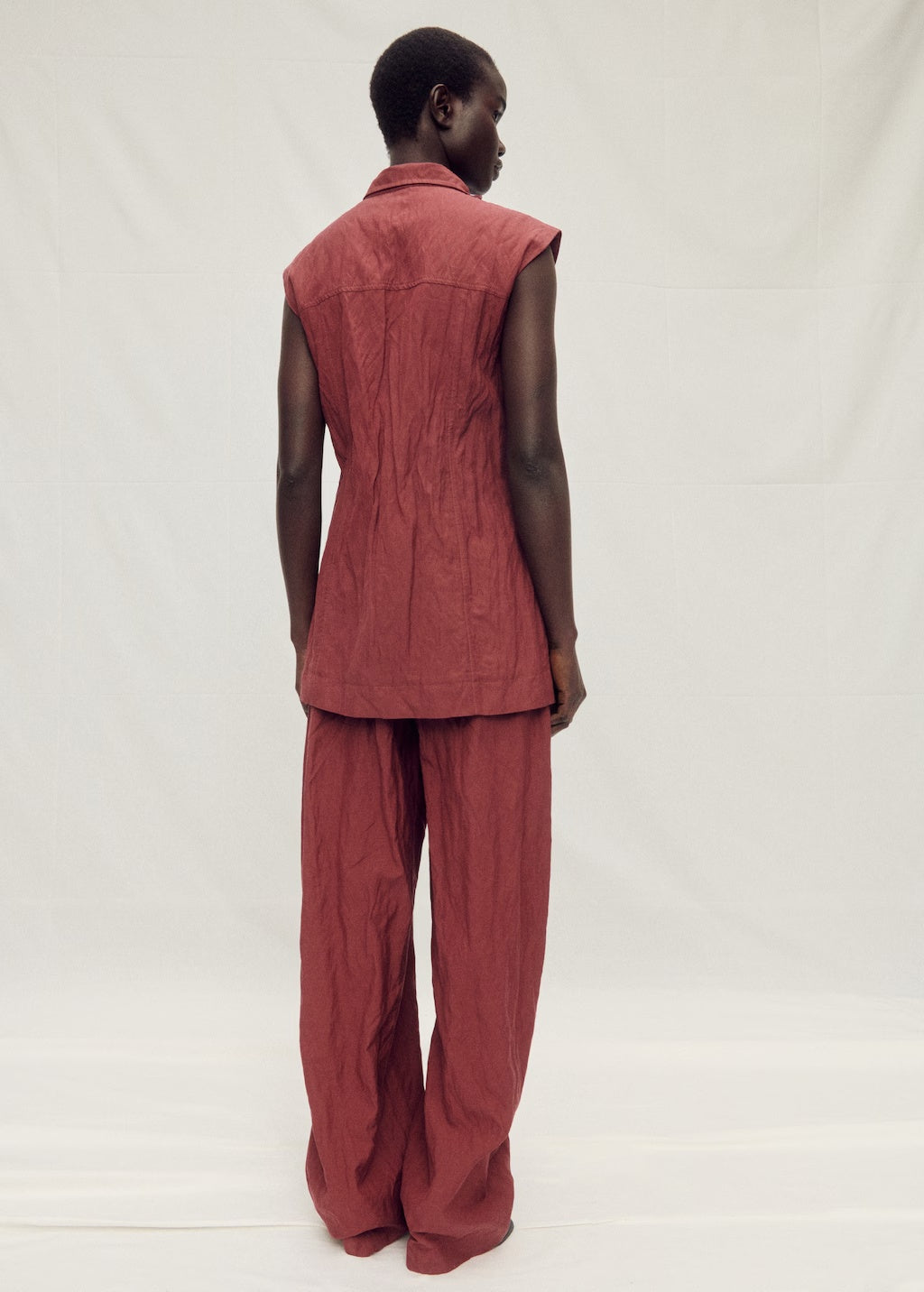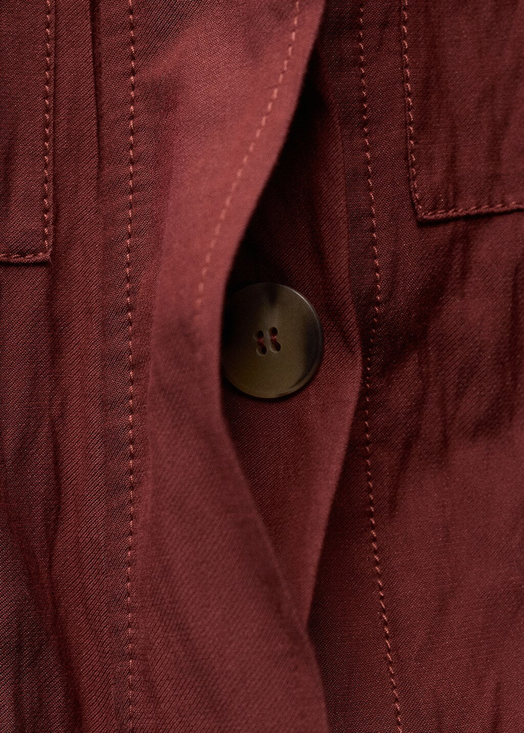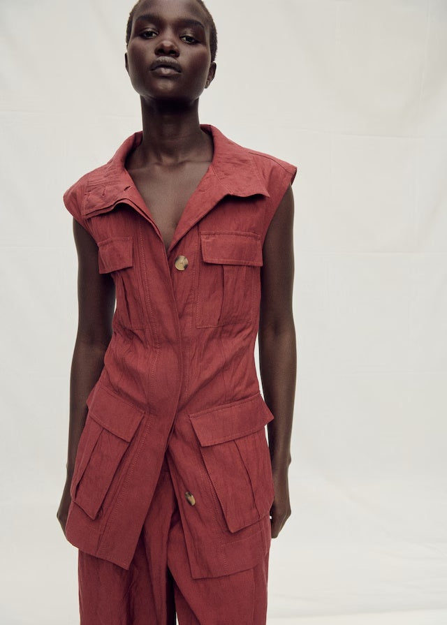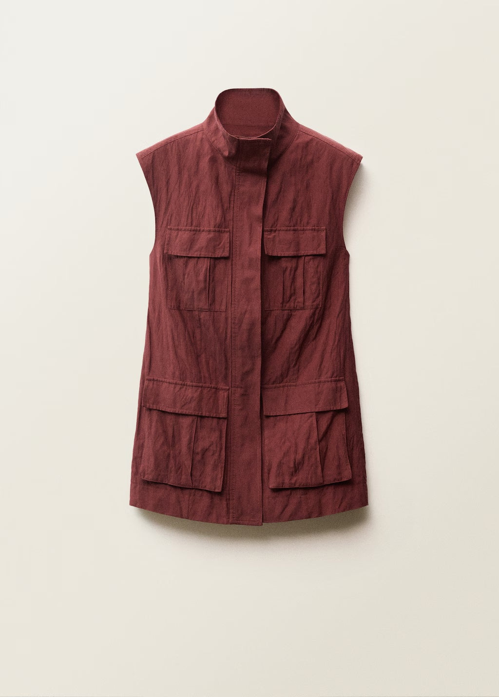 Cotton-blend fabric. Wrinkled effect. Long design. Lapel-collar V-neck collar. Sleeveless. Four patch and flap pockets on the front. Front closure with buttons. Total look. Selection Collection. A selection of refined garments, made with quality materials to create a feminine and contemporary wardrobeProduct Code: 87047718-77