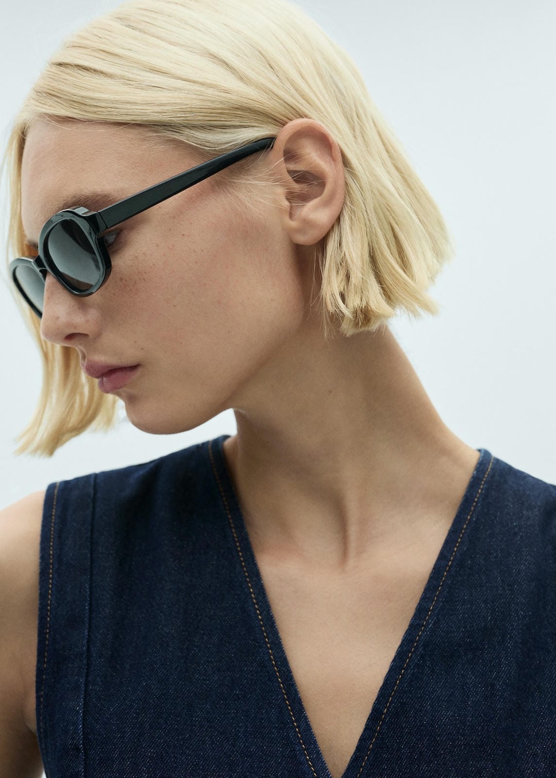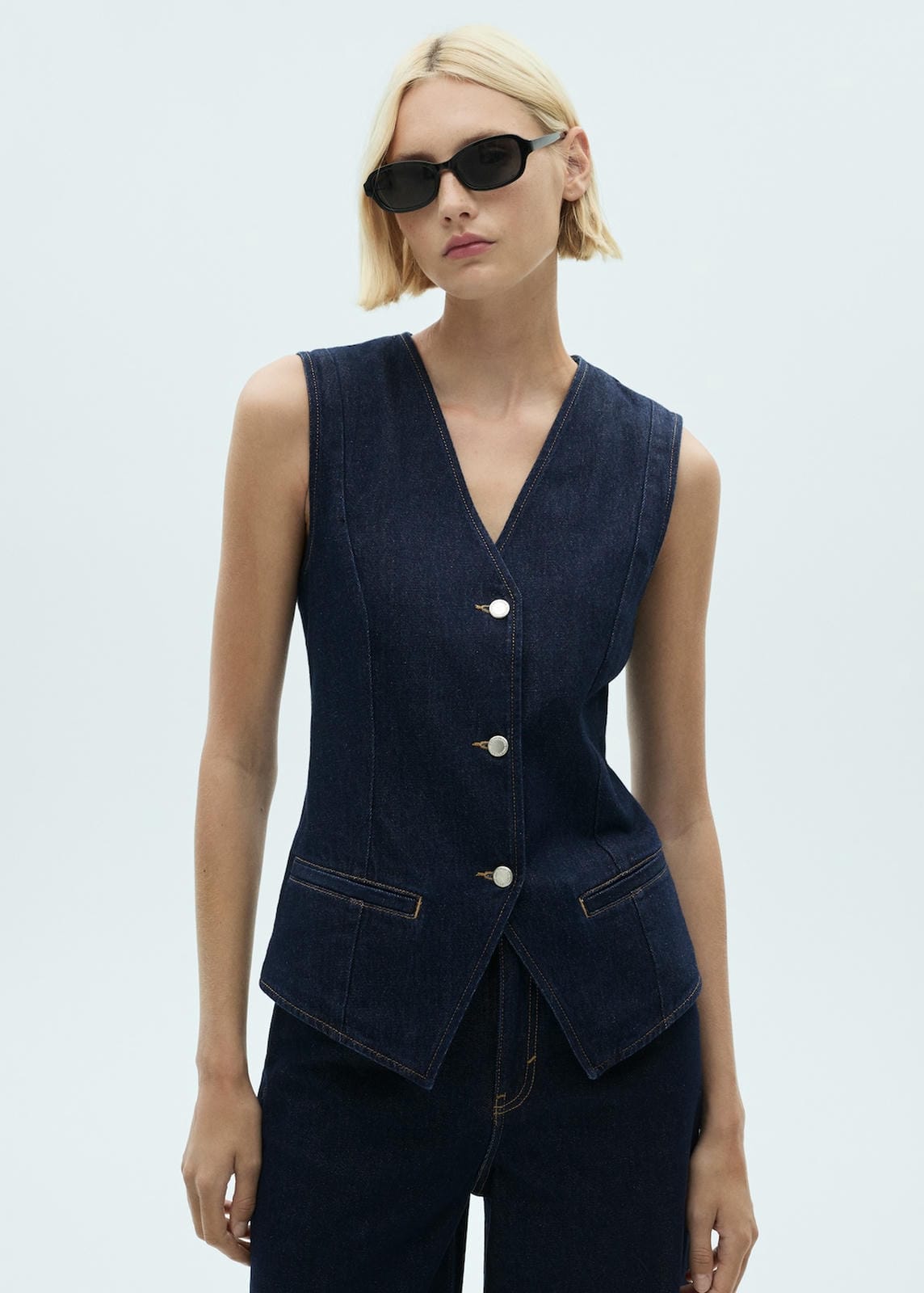 Denim style cotton fabric. Straight design. Rinse wash. V-neck. Sleeveless. Two front welt pockets. Button fastening on the front section. Decorative seams. Co-ordProduct Code: 77068285-TS